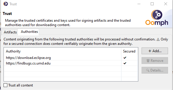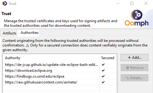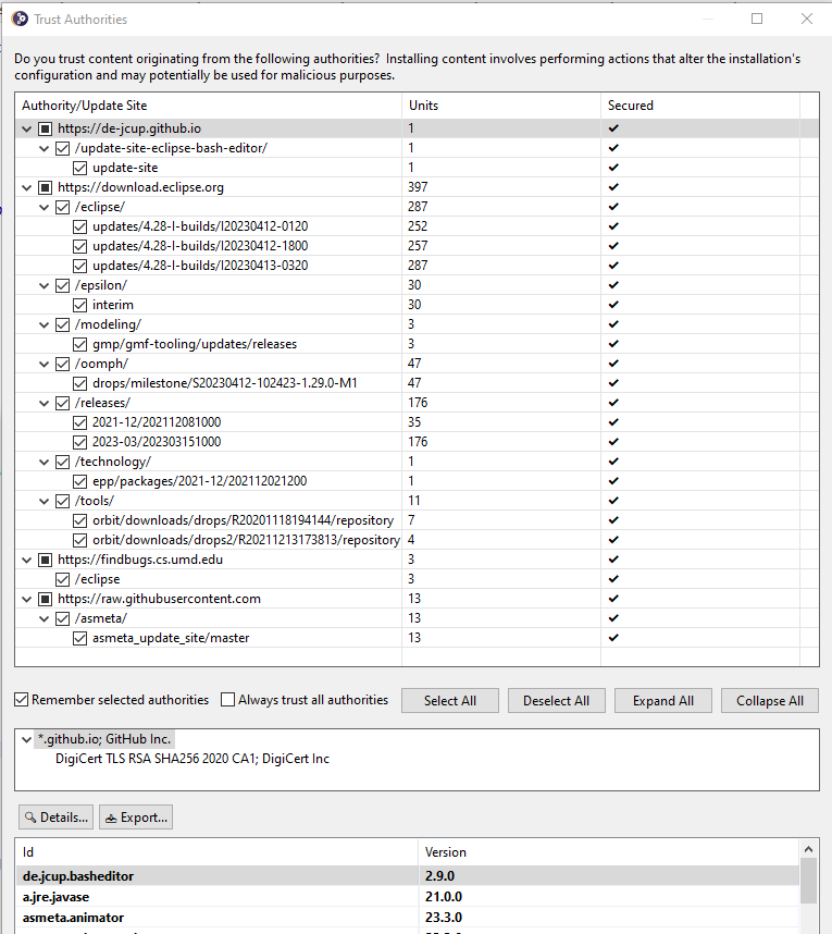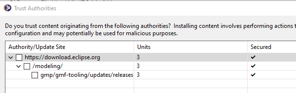 I figured that if one doesn't trust an entire domain one can simply not remember the one-time trust and just be prompted each time for things from that domain. But certainly more flexible is being able to trust subtrees of a domain, especially for places where multiple "organizations" host contents. But showing entire deeply nested subtrees really complicated the view and made it more complicated and more confusing to use, so I tried an approach of showing just one additional nesting level in the tree... So here I did an expand-all and a select-all: The selects-all checks all second level tree nodes and selecting any such node selects all its sub-nodes. I added some of the other examples/sites you mentioned. Note that while https://de-jcup.github.io/update-site-eclipse-bash-editor/update-site specifies a reference to https://dl.bintray.com/de-jcup/basheditor that reference isn't enabled so isn't loaded and hence not present in the above view. The preferences records these things: One can manually add trust for deep subtrees if that is desired as I did here, removing https://download.eclipse.org/modeling/ first: Then I would still get prompted for GMF but not for EMF: If I trust an entire domain, the trusted subtrees of that domain are removed because they are redundant then: What do you think? For multiple selection I now show this in the details: |