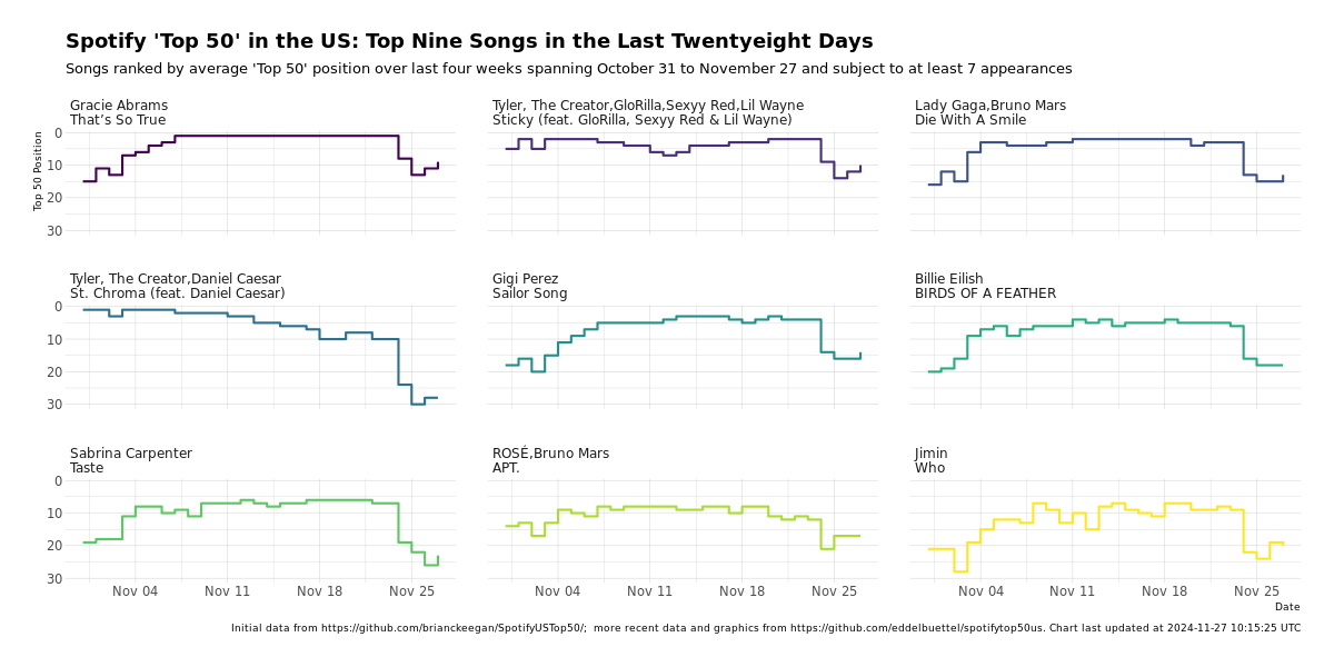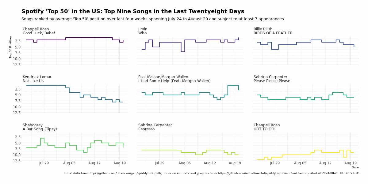 Note: As of November 27, 2024, the 'global top 50' API endpoint is no longer provided by Spotify to this worked example is no longer operational which is rather sad. So the repository no longer updates each night.