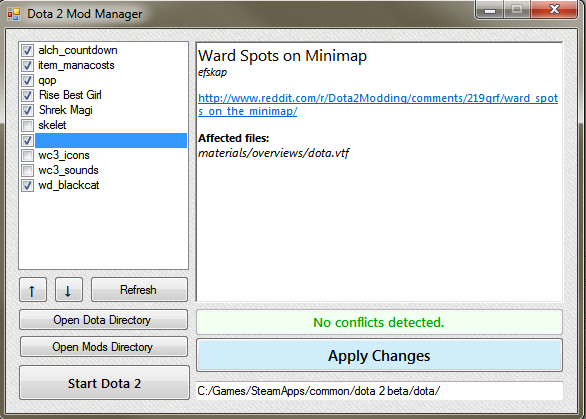 Manages Dota 2 mods, allowing installation/uninstallation and reordering.