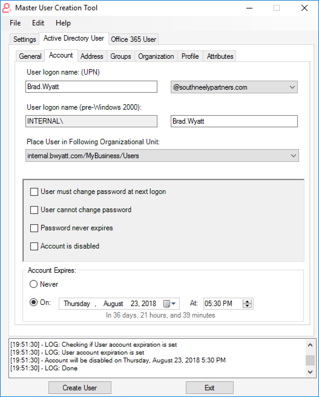 Quickly and easily create and configure Active Directory and Office 365 Users at once. In Active Directory Users and Computers if you want to enter items like E-Mail, password, group permissions, login scripts, home drive, etc. you would have to complete the new user wizard, find, and then edit your user in Active Directory, and fill in the necessary information. Master User Creator lets you configure hundreds of items for your user without ever leaving the wizard. You can configure items like: