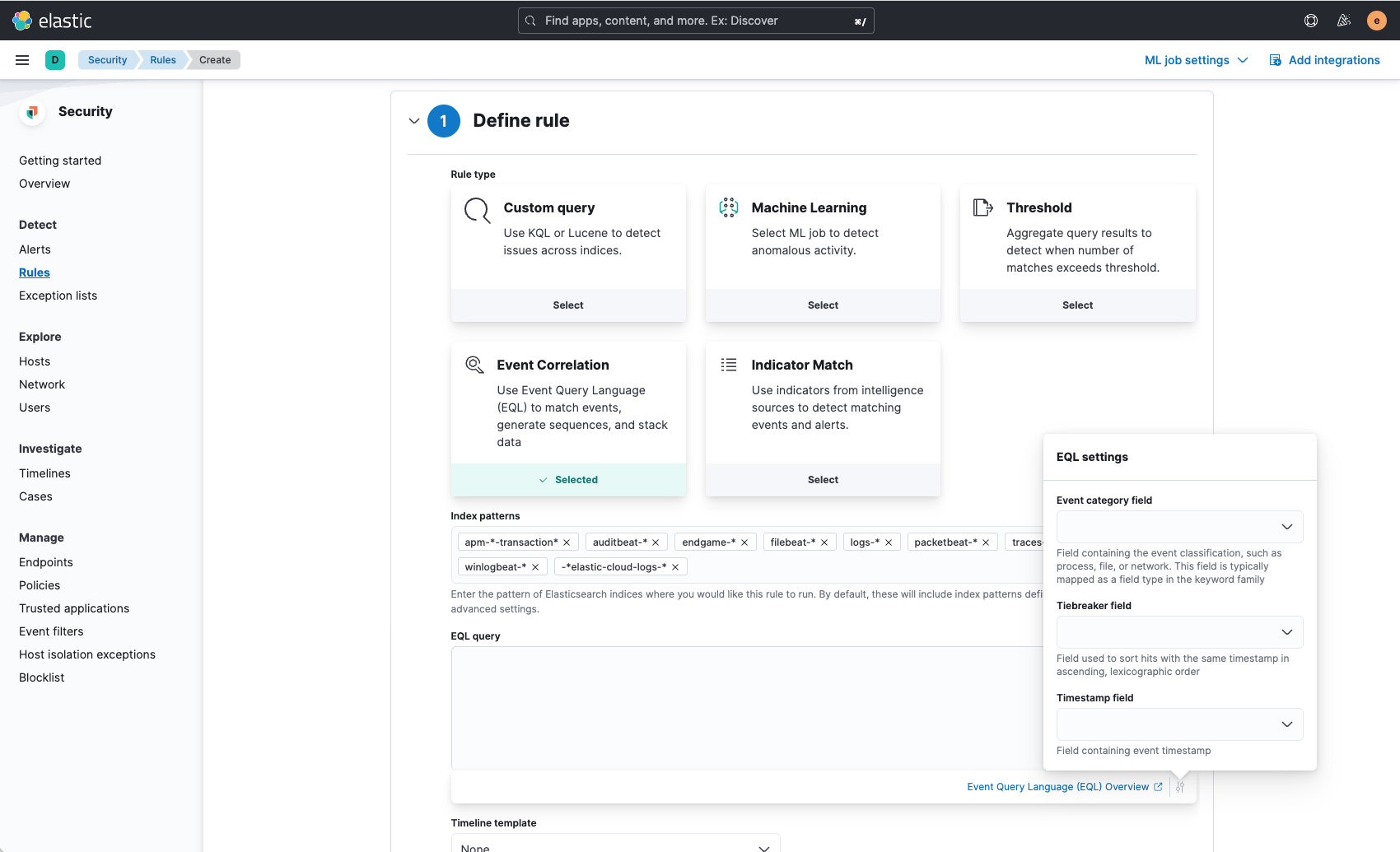 - Links to Elasticsearch/EQL docs on timestamp and event category field and tiebreaker field
