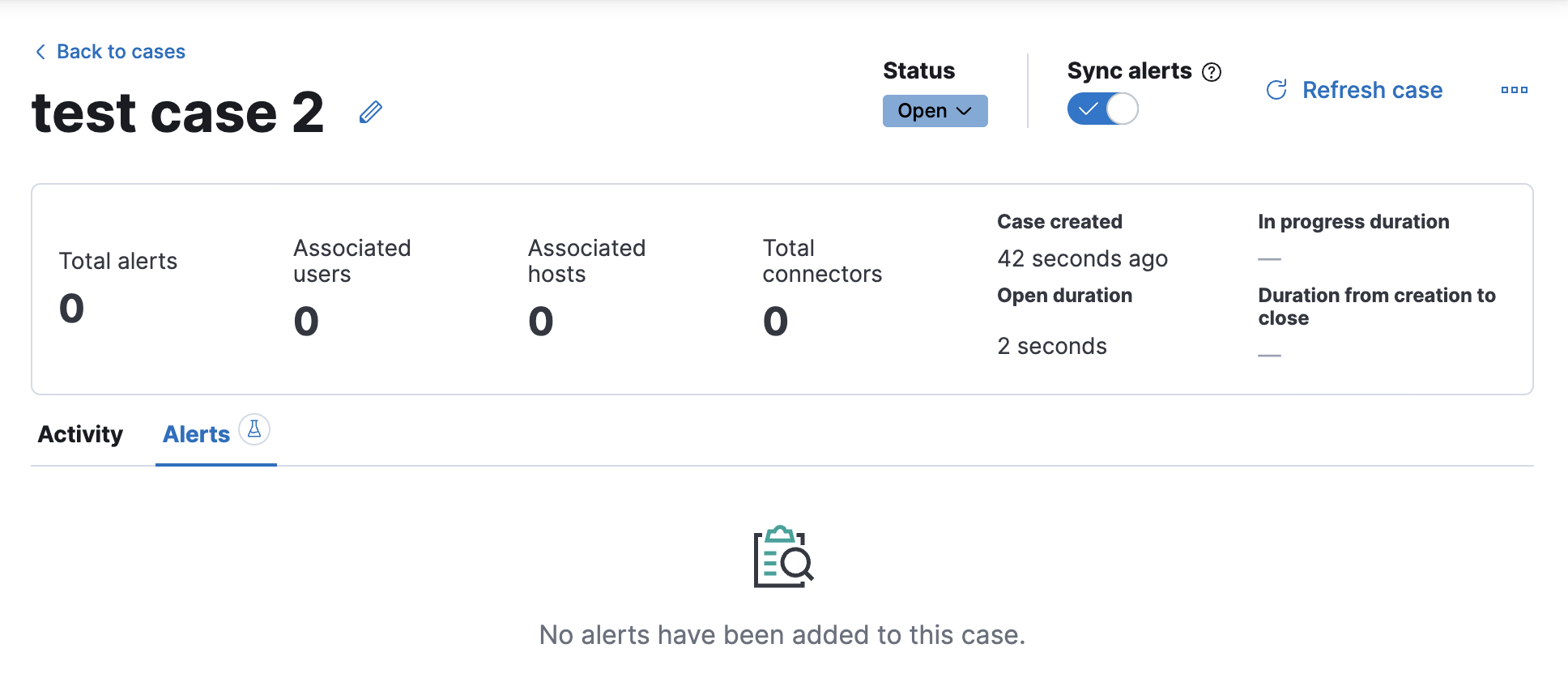 Cases now show two tabs: Activity and Alerts. From the Alerts tab users can view all of the alerts that are currently attached to the case. If no alerts are attached to the case, the following message displays on the Alerts tab.