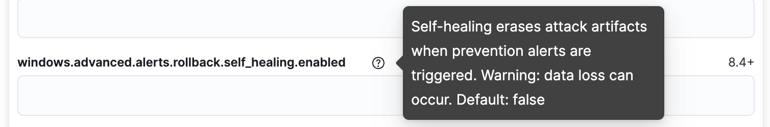 New "self-healing" endpoint policy advanced setting enables automatic rollback of 5 minutes previous to any "Prevent"-related endpoint alert. Windows only. By default, this setting is NOT enabled.