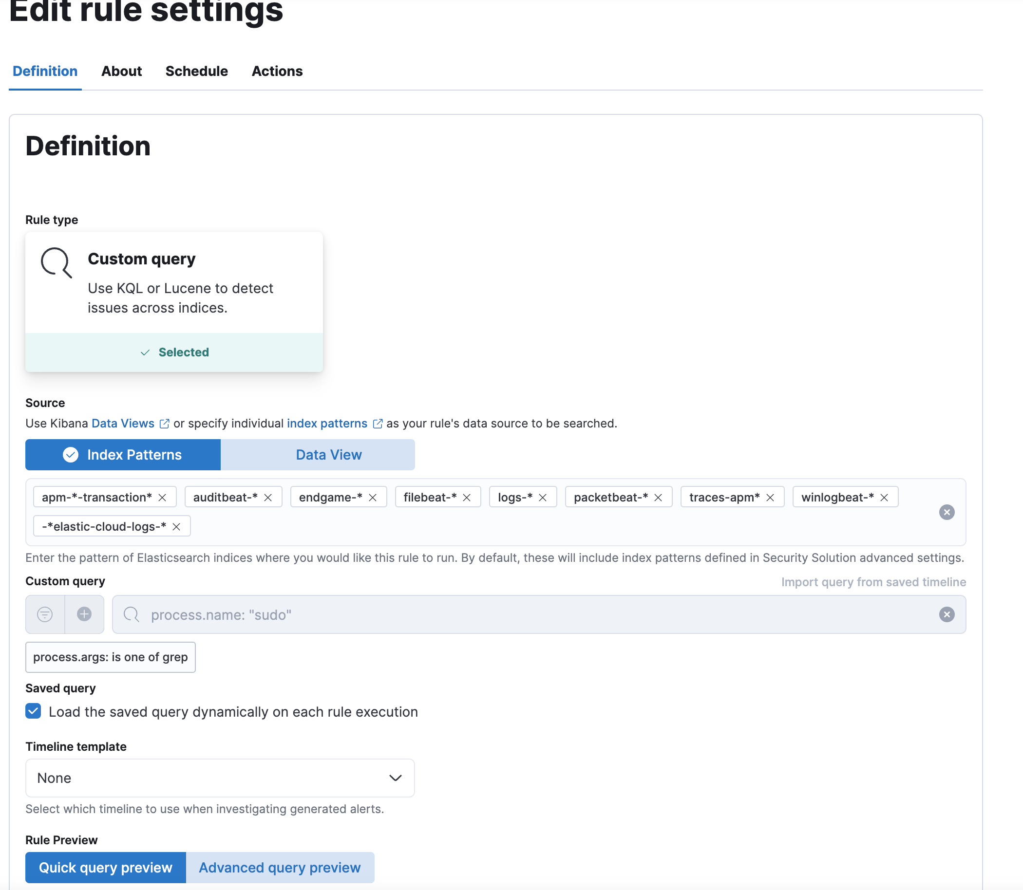 - shows on rule details page saved query name and loads its filters and query, so these values shown to users, will always be up to date with the saved query