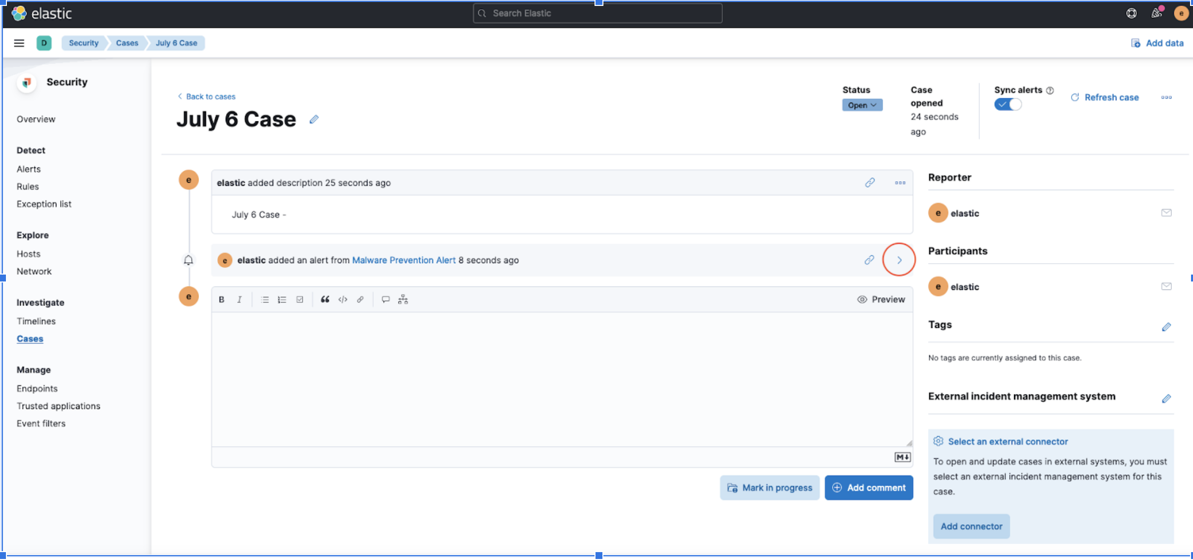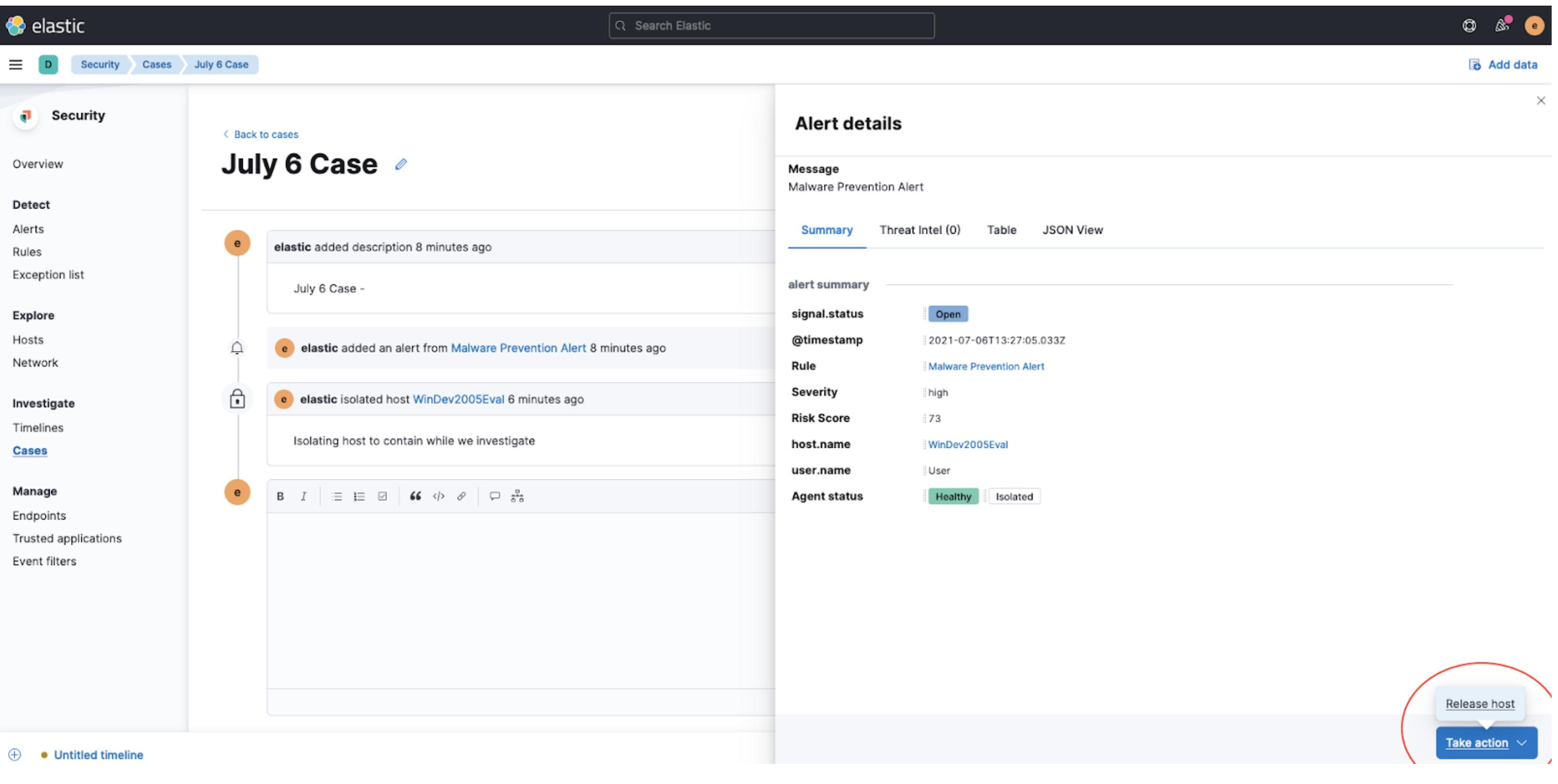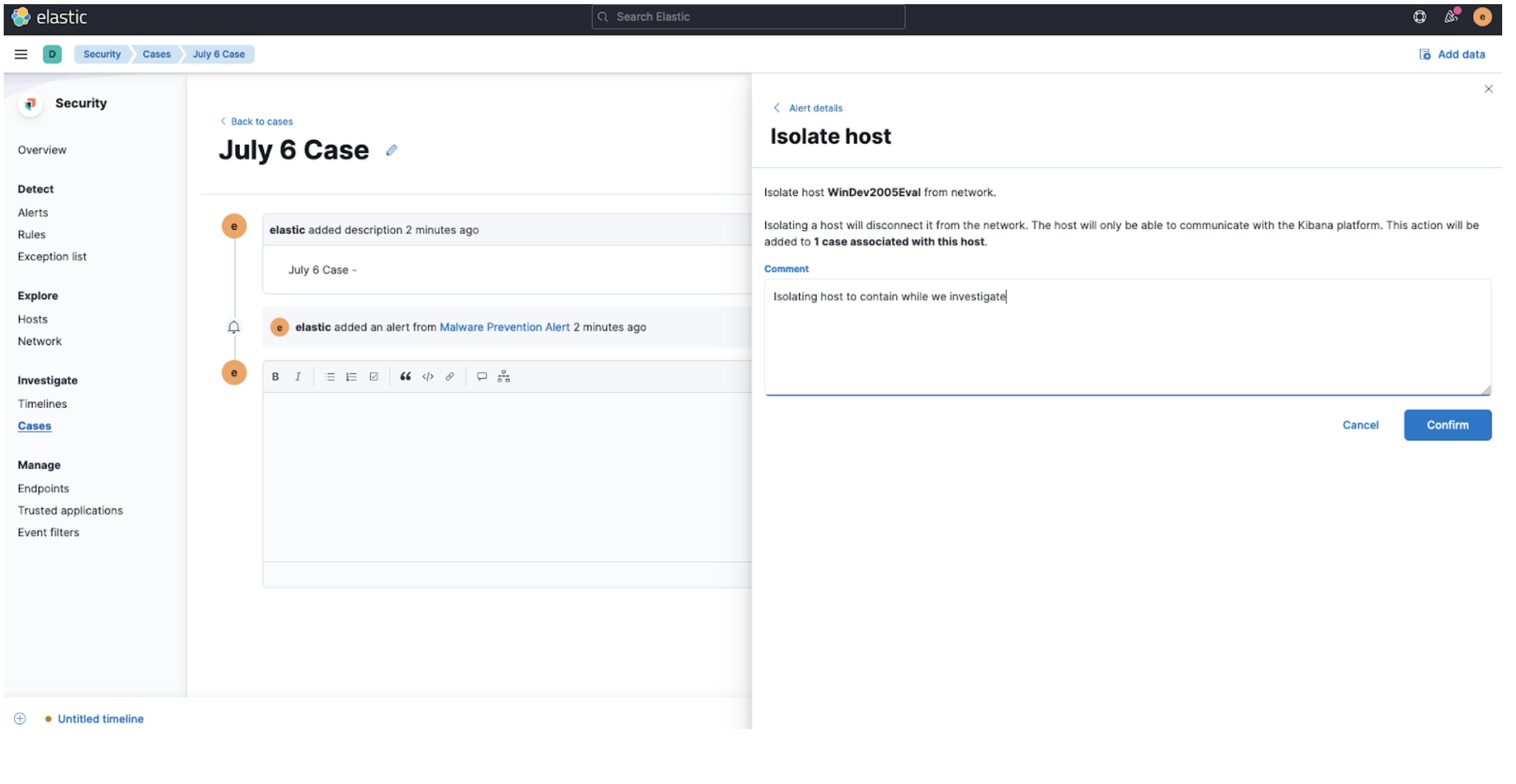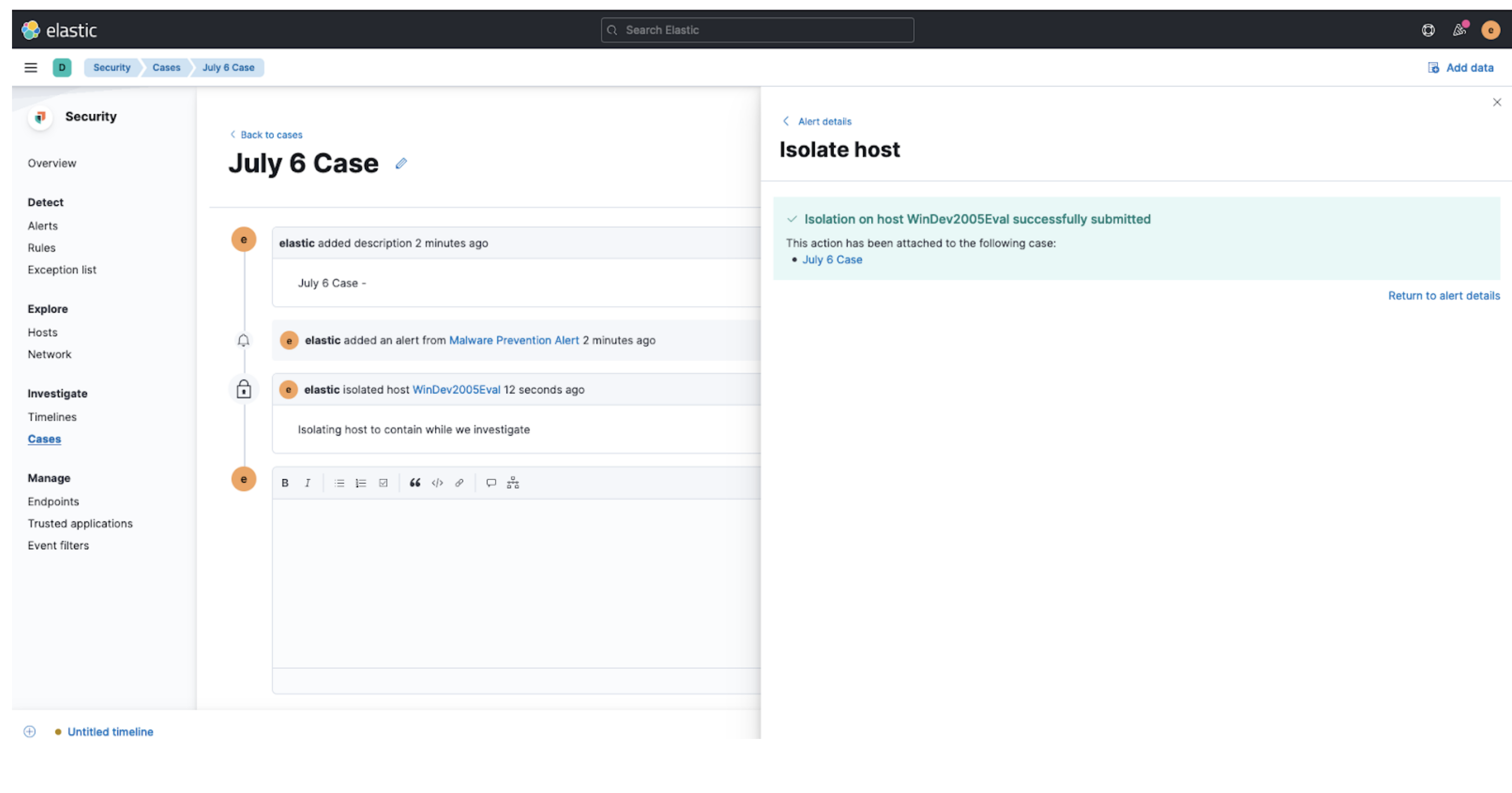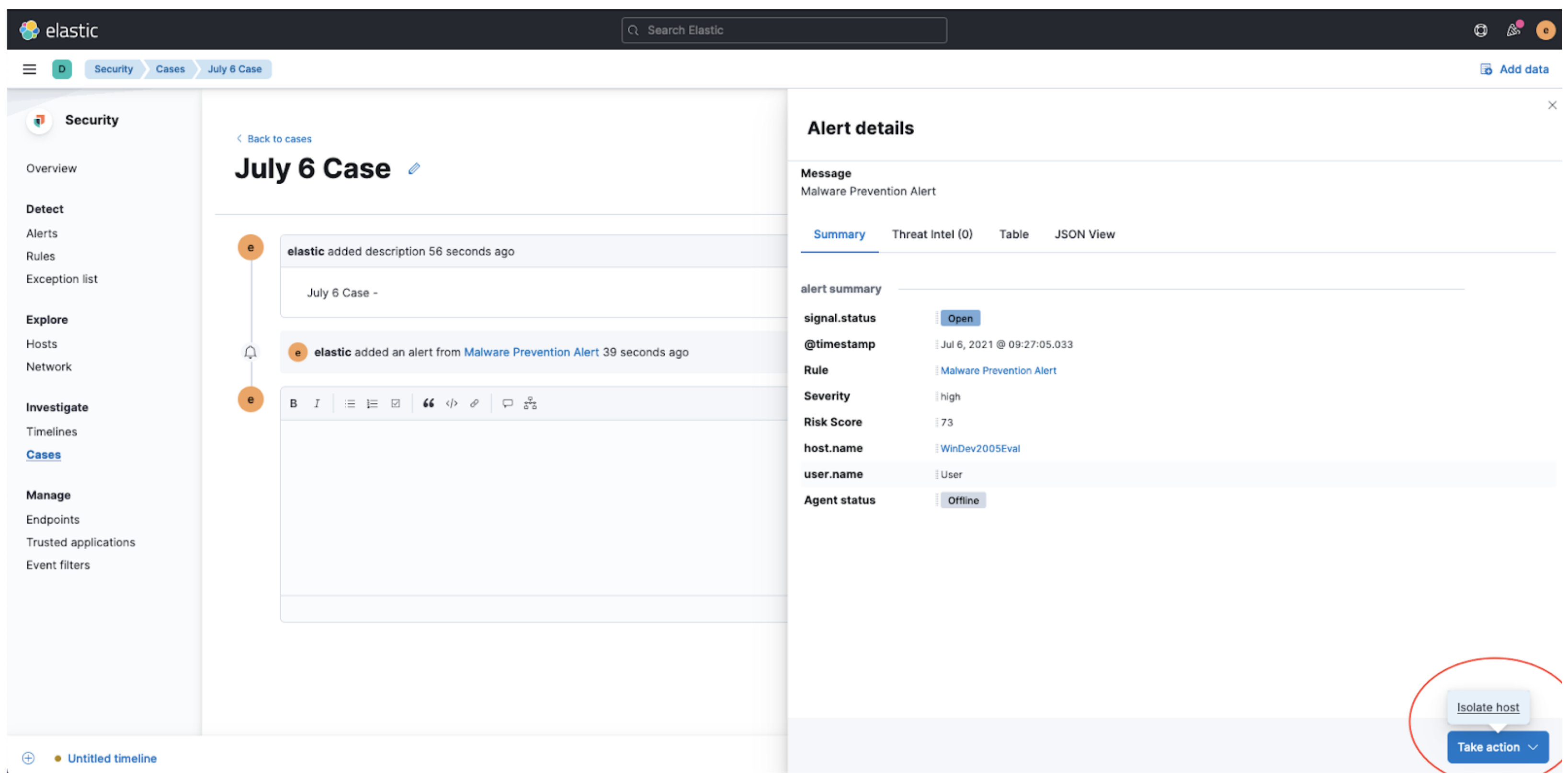 User can initiate the Isolate Host action 1. via the alert details, from a Case; or 2. the endpoint details. Below shows the alert details/Case flow.