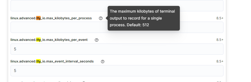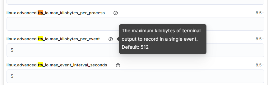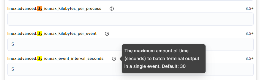 max_event_interval_seconds how long to wait for the next tty_write call before sending the event to elastic. As an example, if you started a session, and typed nothing and then waited. The endpoint would wait 30 seconds (since bash hasn't exited yet), to send up the output generated so far (most likely a welcome message and an empty prompt). This setting could be reduced to say 5 seconds, if a user cares about seeing more frequent updates.