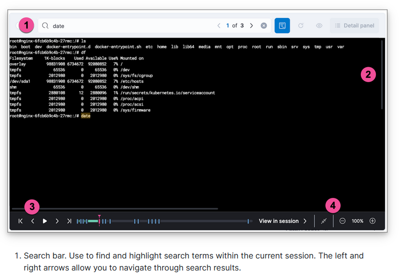 "Use to find and highlight search terms within the current session's terminal output held by the browser. Note that because terminal output may include terminal codes for colorizing the text and moving the cursor, some searches may not find a match. For example, if one is searching output for a command like "sudo" (echoed command input) and the user mis-entered "sudo" as "sdo", and moved the cursor back to insert the missing "u", the terminal output search for "sudo" will not match. This challenge can also be present in visual editors like vi and emacs where cursor movement for editing is commonplace"