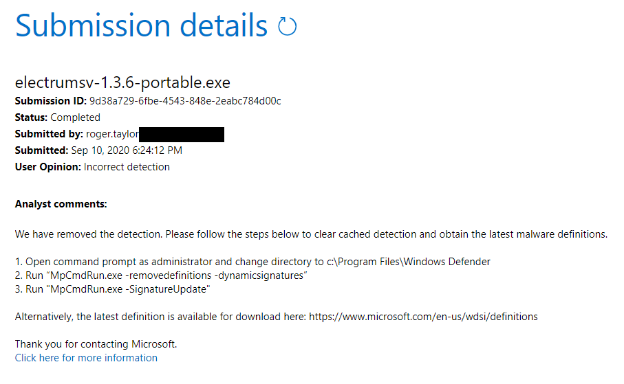 Thank you for reporting this and for providing all the information, the malware name and defender db information are required for reporting so it's much appreciated. I've filed a false alarm report with Microsoft. The builds are generated on Azure CI automatically as are the hashes, so if the hashes match then these are the files that came from Amazon.