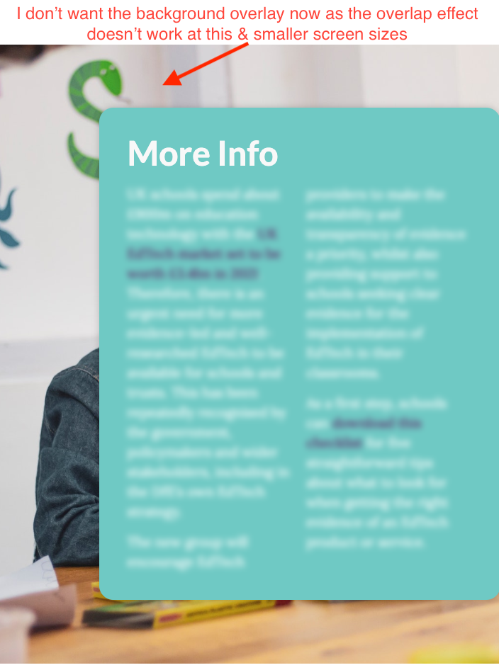 For example it is currently possible to easily achieve an overlap image effect (like one below) on desktop using the background overlay and setting a custom width in the css. However because we have no responsive controls for the background overlay itself it is not possible to adjust or remove the image on mobile devices (where the overlap style doesn't work) without resorting to custom css overrides and media queries which aren't as intuitive and separate to where we set the image itself. Whilst It is nice to be able to change the image to a different one responsively, what about if it just needs to be removed or the background type needs to changed to something that works better on a smaller device?
