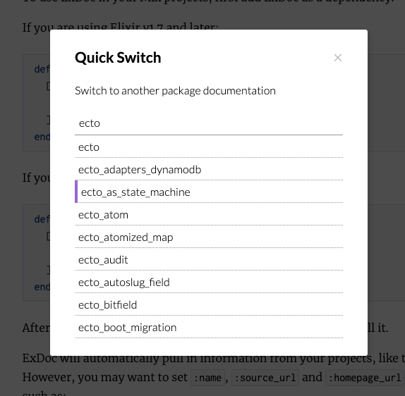 This PR adds a 'quick-switch' modal that is opened by pressing g and can be closed by pressing Esc, similar to the keyboard shortcut help modal. You can enter any term and hit enter, and it will directly take you to the corresponding docs on