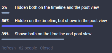 I generally find the info handy to see how much traction on the platform a post has gotten, especially if it's a PSA type of post, but as I mentioned above I find the numbers distracting when scrolling the timeline, (perhaps I'm alone in thinking this is needed, but just wanted to share this idea here with hopes of other people finding it useful as well) Edit: I'm gonna run a 3 day poll to see how many people would prefer it this way, gonna post the results once it's done :) |
