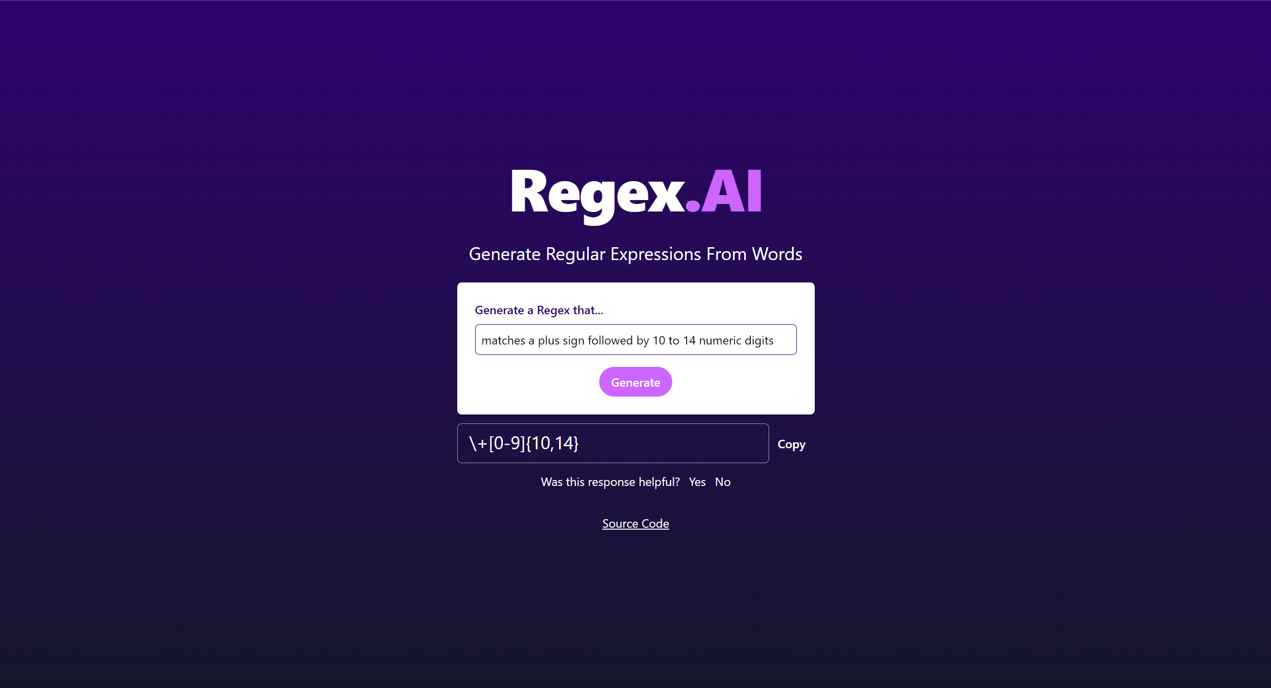 Regex AI is a tool for generating Regex patterns from natural language built on GPT3. To get started visit https://regexai.vercel.app and try entering a prompt as shown below!