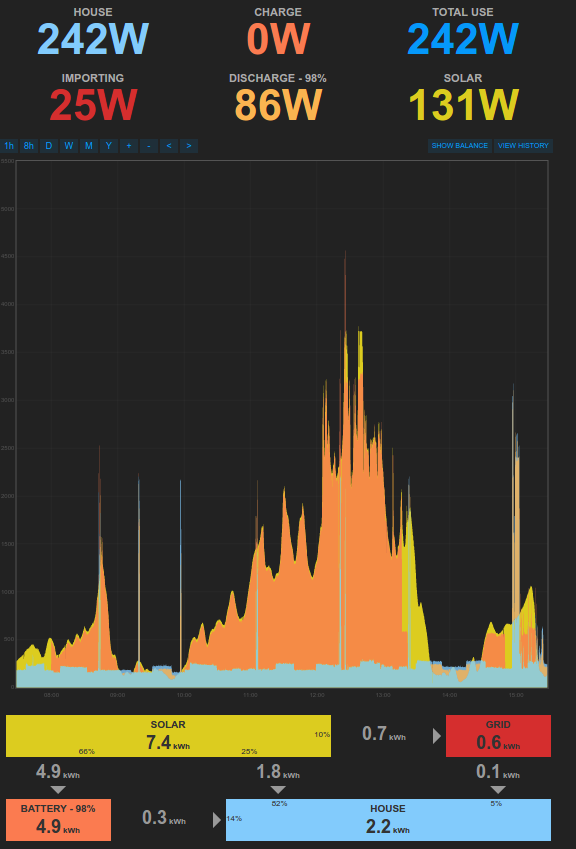 Yes it does look impressive, although I do have concerns about whether this should (currently) be an extension to the "mysolarpvdivert" app or a separate "mysolarpvbattery" app. I suspect any proposed change in "use" to include "divert" would not be backwards compatible and therefore involve users changing their processing and there fore creating a new feed or re-purposing the existing feed to include divert, making the historical data incomparable to newly collected data. I think it's great that the app can dynamically alter depending on the feeds found BUT I do not think this suits all use cases. Many more users have DHW diverters and/or underfloor heating etc and only a small number have battery systems, I would hazard a guess and say just as many (if not more) have regular diversion to DHW/heating AND a battery system, as battery alone. in which case DHW and other diversion would be lumped in with charging the battery OR unaccounted for and just inflate the "use" without explanation. If this was a separate "mysolarpvbattery" app then users can use the apps independently for either a battery only or a regular diversion system until an app can cater for both by reporting diversion and charging separately. I think diverted consumption and diverted charging need handling slightly differently and therefore cannot be combined as a single diverted In the same way "mysolarpvdivert" was added alongside "mysolarpv", this might be better placed, being added as "mysolarpvbattery" to avoid any complication and retain a choice, certainly until a "mysolarpvdivertbattery" app can cater for all. The changes @TrystanLea has recently made to the apps module is to promote development of more apps so there seems little need to replace or remove an existing app. IMO it would be great to see this included but not replacing the current app (yet). I look forward to any comments from @mattjgalloway or @TrystanLea, |