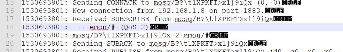 Are we looking at the same file? That is line 18 in the attached file I think it must be the wrong file as it doesn't cover the 1530695441 timestamp period. That line This block shows emoncms connecting to the broker and then subscribing to emon/#, it also shows emoncms publishing a single "power" value. the next block shows another client connecting (node-red?) and then subscribing to 9 topics (each QoS1 except the greenhouse/rssi which is QoS0). The lines that follow show each published value from emoncms being recieved and re-published to node-red (mqtt_298f26c0.b46dca). There were 212 queued values passed to node-red, I think the first item in the queue was published by emoncms before node-red connected so that first item wasn't passed to node-red. But all of these transactions, including emoncms connecting, subscribing, publishing 213 values and nodered connecting subscribing to 9 topics and receiving 212 values all happened in a single second. From there on you can see 3 value published by emoncms and received (or rather sent to) node-red each 5 secs. It's also interesting that despite all the traffic, the php-mosquitto extension still seems to feel there's a need to PING the broker every 5secs to keep the connection alive, that's only supposed to happen if it goes 5s without a control message. (I wonder if that's a "if less than 5" type issue and if set to 6 would get a 5sec timeout?)