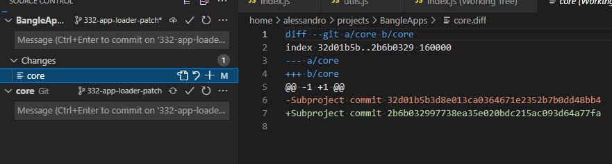 When I make a change in the core submodule VS Code shows me a "core" under the changes of Bangle Apps:
