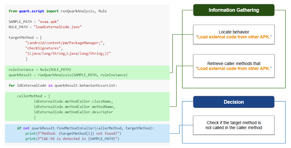 loadExternalCode.jsonto spot on behavior using the methodcreatePackageContext. Then, we find the caller method that calls thecreatePackageContext. Finally, we check if the methodcheckSignaturesis called in the caller method for verification.Quark Script: CWE-94.py