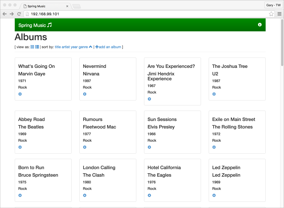 We will use a sample Java Spring application, Spring Music, available on GitHub from Cloud Foundry. The Spring Music sample record album collection application was originally designed to demonstrate the use of database services on Cloud Foundry, using the Spring Framework. Instead of Cloud Foundry, we will host the Spring Music application locally, using Docker on VirtualBox, and optionally on AWS.