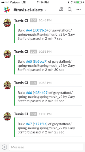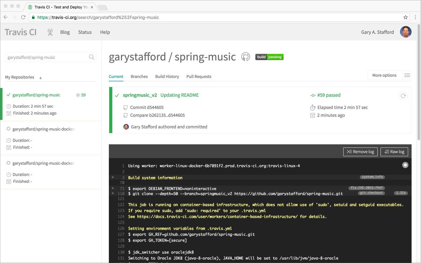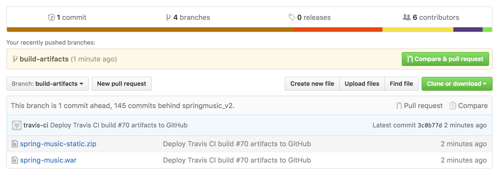 In this post's example, two build artifacts, a WAR file for the application and ZIP file for the static web content, are built automatically by Travis CI, whenever source code changes are pushed to the springmusic_v2 branch of the garystafford/spring-music repository on GitHub.