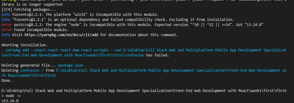 error postcss@8.2.2: The engine "node" is incompatible with this module. Expected version "^10 || ^12 || >=14". Got "13.14.0"