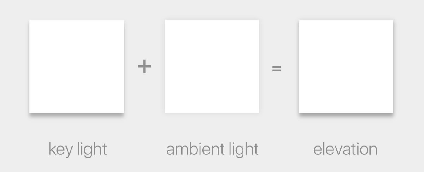 The rendered shadows are a combination of both an ambient shadow (soft) and a spot (hard) shadow which produce the Material design elevation effect.