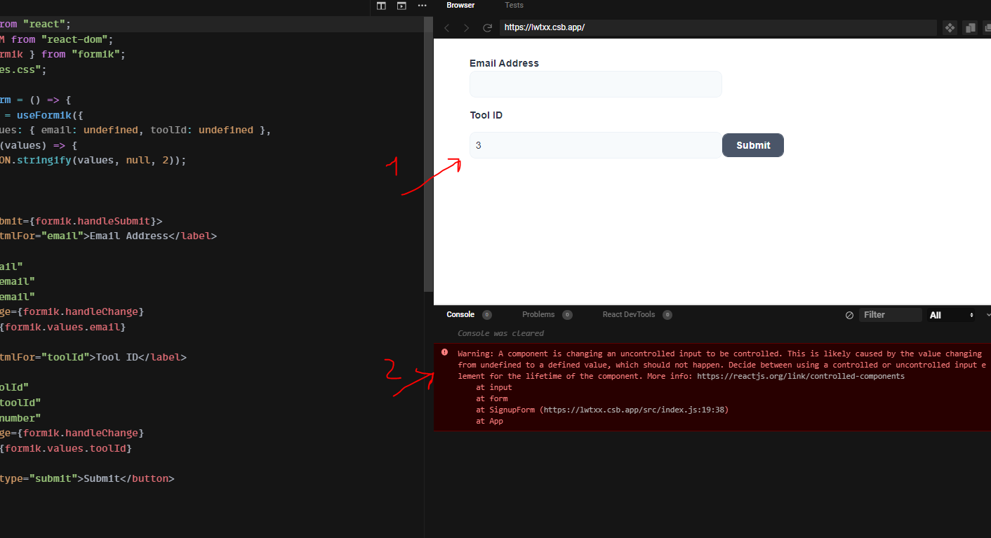 - Go at https://codesandbox.io/s/warning-issue-formik-v2-tutorial-start-forked-lwtxx?file=/src/index.js