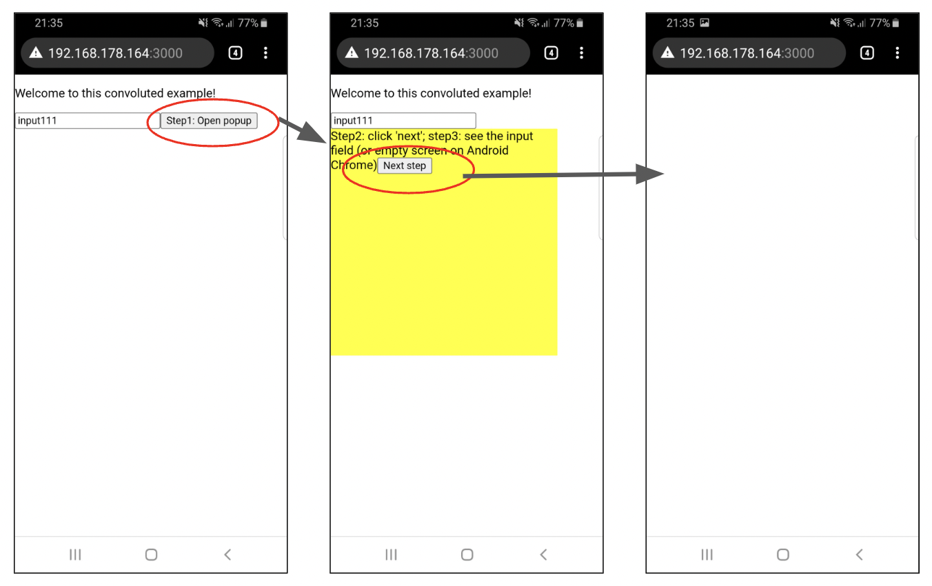 (2) Open the page on desktop and on an Android phone in Chrome v.101.0.4951.41 (I think it's the last version at the moment). Observe that there is one input "input111" and one button "Step1: Open popup".