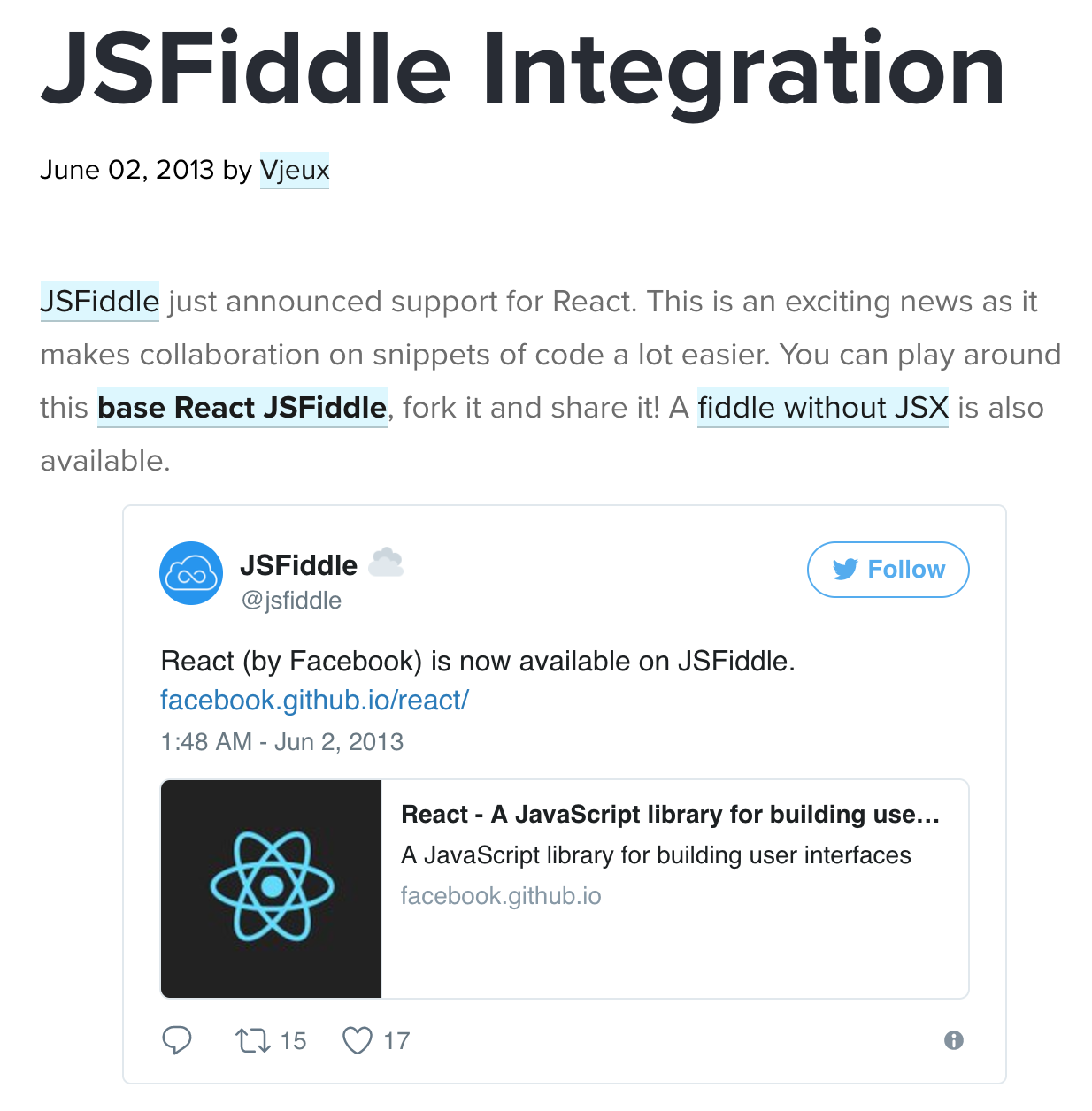 <script>tags fromindex.mdgatsby-plugin-twitter(rather than embedding<script>tags in markdown) to auto-load Twitter JS for embedded tweets whenever a blog post with an embedded tweet is loaded.Screenshot of /blog/2013/06/02/jsfiddle-integration.html