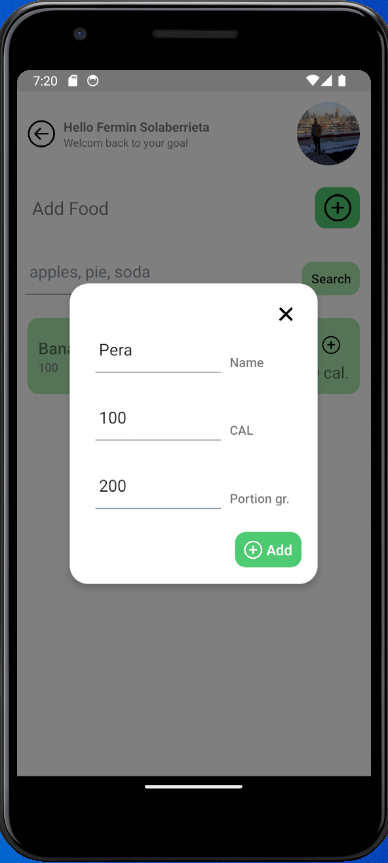 - Registra alimentos nuevos con sus respectivas calorías y gramos.