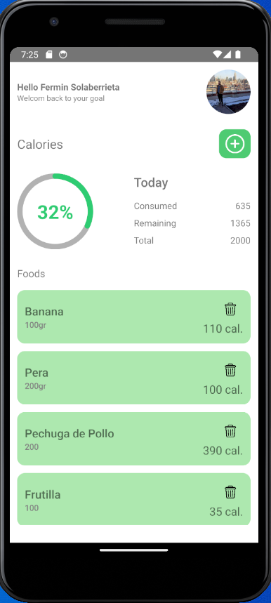- Gestión de Alimentos: Agrega, edita o elimina alimentos de tu registro calórico.