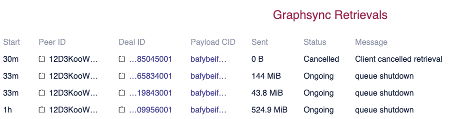 In the below screenshot, I ran 4 retrievals using https://github.com/filecoin-project/lassie and canceled all of them mid download. 3 of the 4 retrievals got stuck in the 'Ongoing' state.