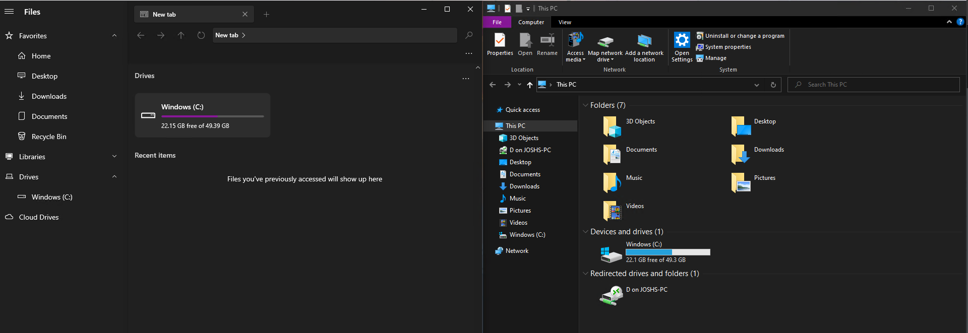 When I'm using the Remote Desktop client or Hyper-V and set it to redirect a drive it will show up in the normal file explorer but not files.
