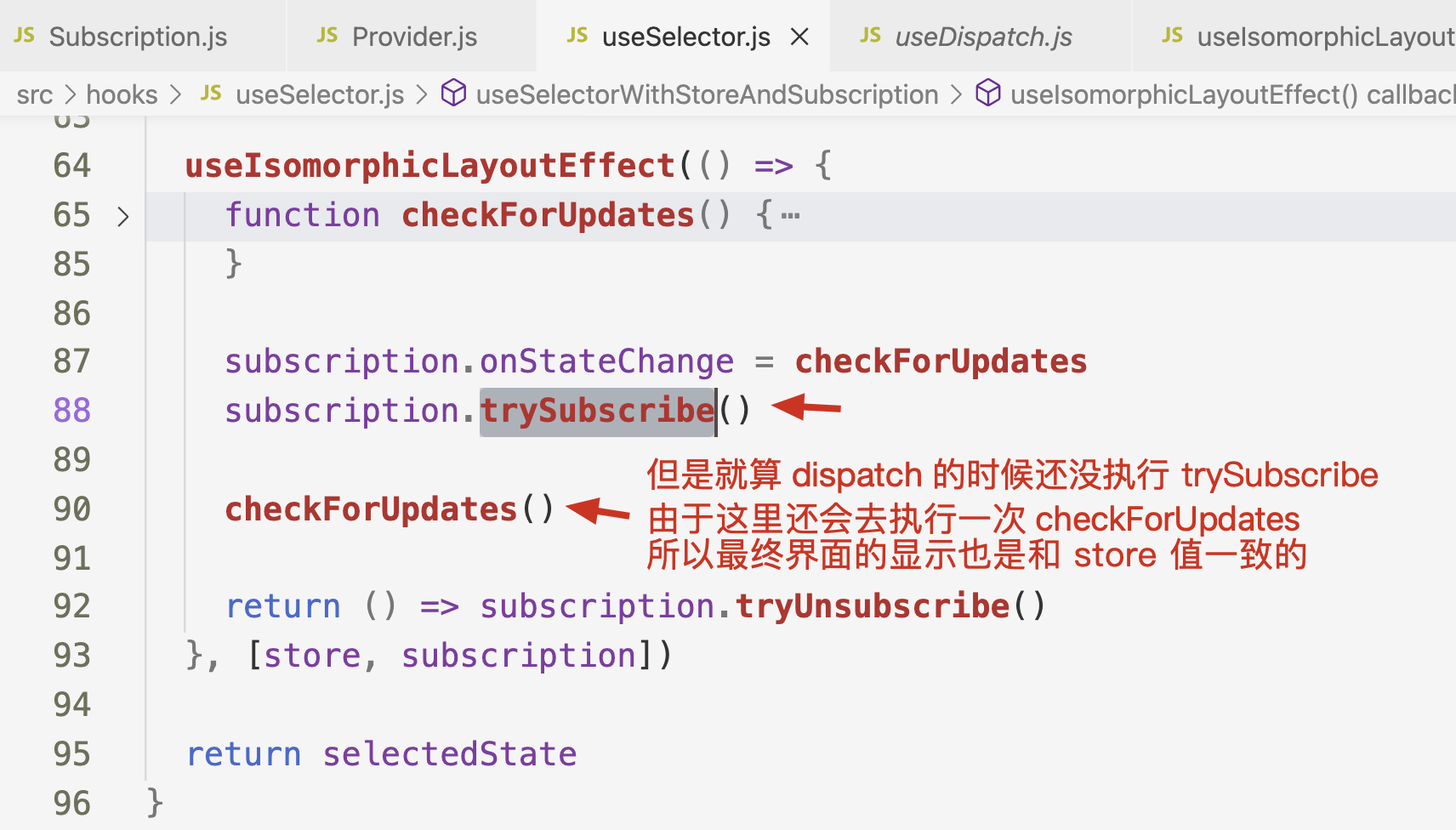 如果要强行解释的话,我只能说使用 useLayoutEffect 可以使得 trySubscribe 更早的执行。比如如果说在 useSelector 中是使用的 useEffect ,那么下面代码就会导致 dispatch 时 useSelector 中 checkForUpdates 还没注册: