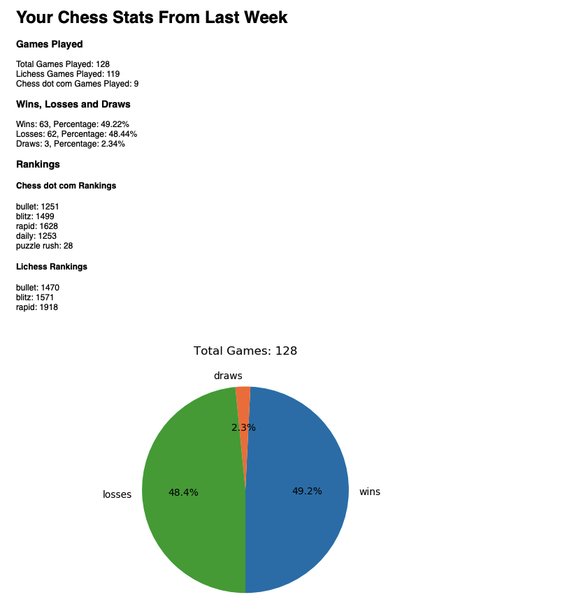 As a bit of an online chess addict, I use both chess.com and lichess.org. Inspired by the personalised 'year in review' email that chess.com send their users, I thought it would be nice to have a weekly email of my combined stats from both websites. Both websites have APIs, which I use to calculate information such as win percentage, current rankings and a few charts thrown in for good measure.