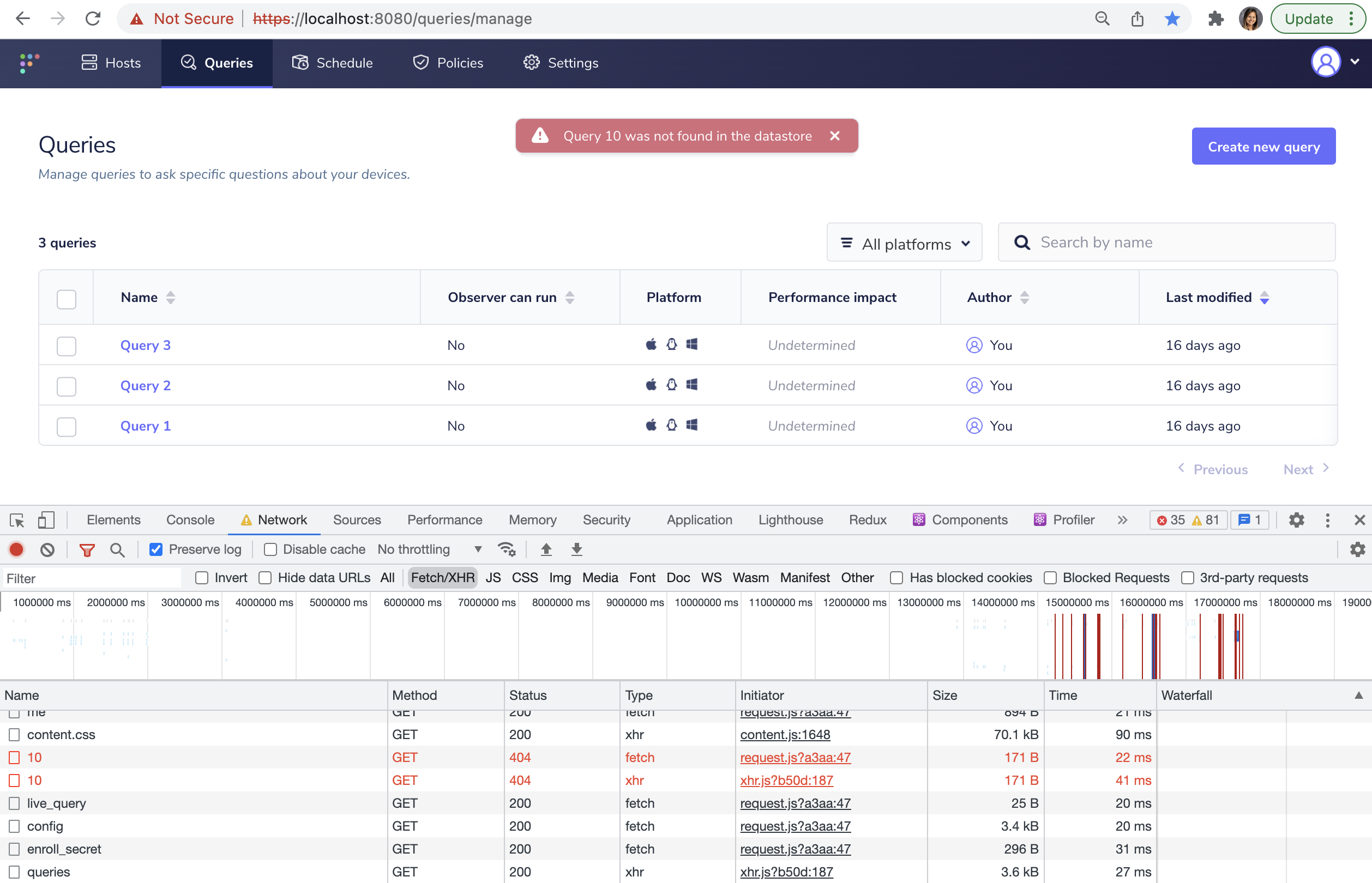 - Query details page: hangs on loading state for a few seconds, redirects to manage query page with error flash message created from error from API