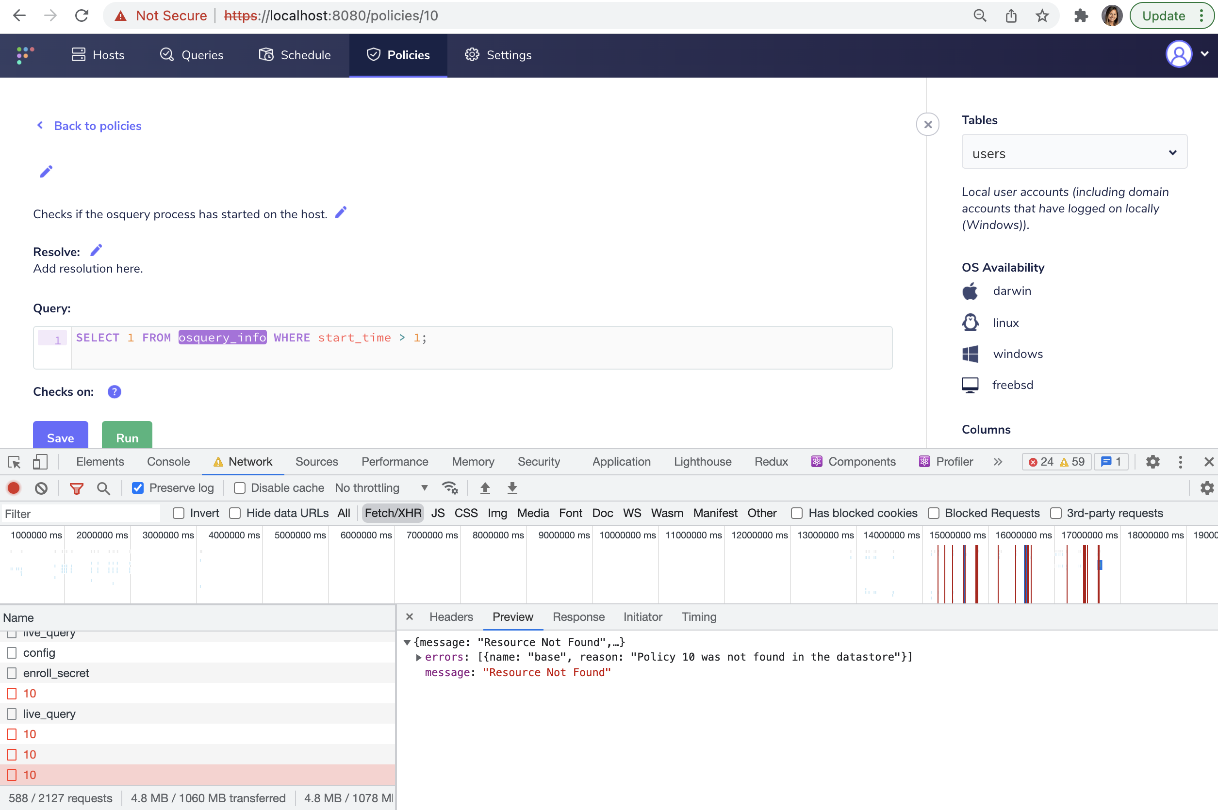 When I go to those pages, I expect to see the 404 overlay because that host, query, policy, and team no longer exist: