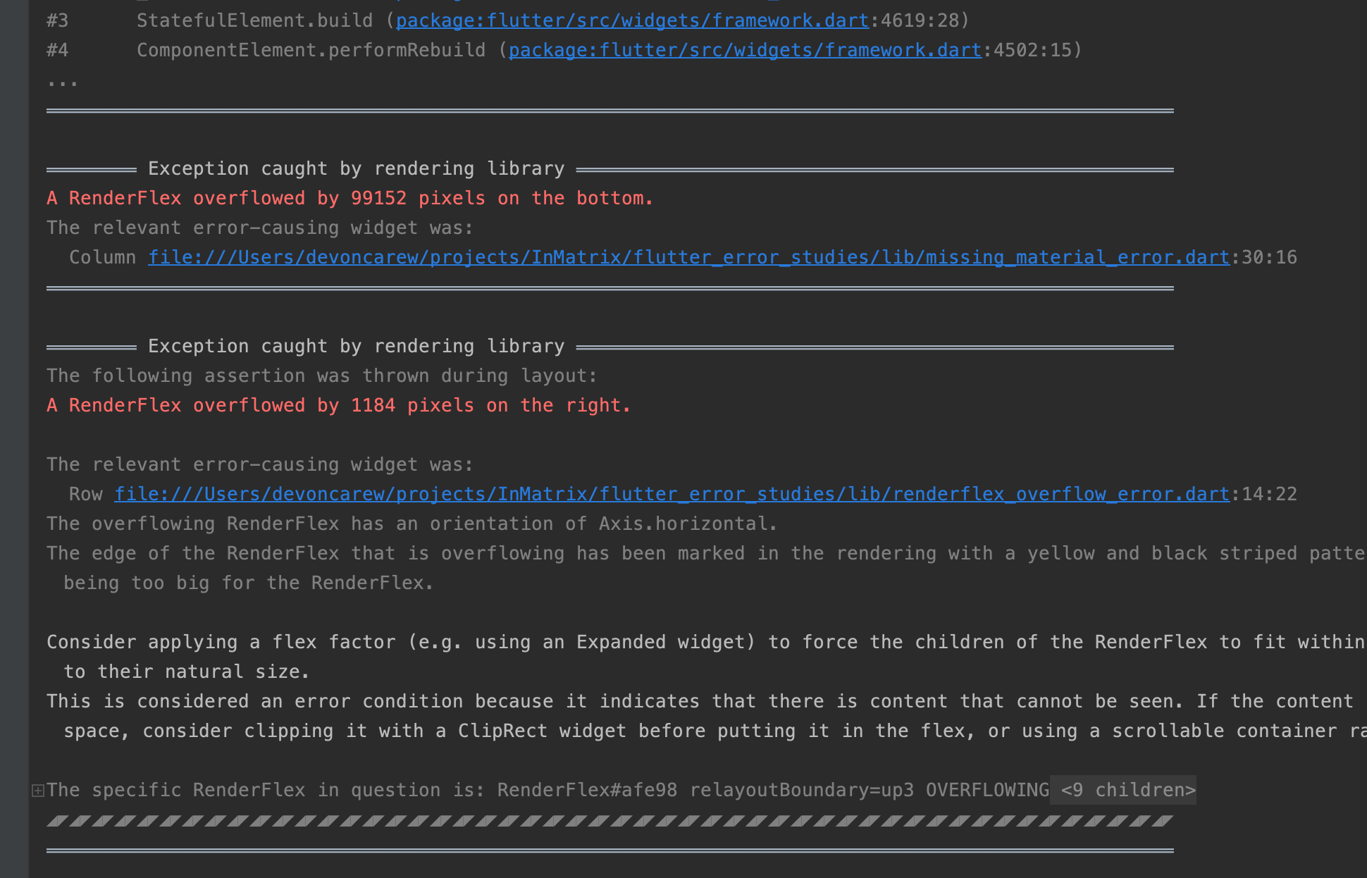 From the flutter error sample app, navigating to the material error, then the overflow error, you can see now that the overflow triggered by the material error is summarized, but the later overflow from the overflow page is not.