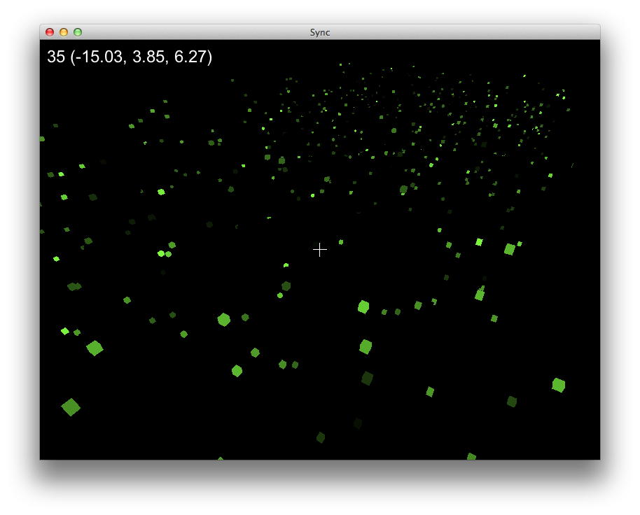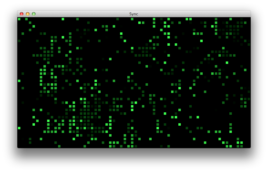 Each cell charges following a curve similar to a charging capacitor. When the cell reaches a threshold, it fires causing a blink in the visualization. The cell firing also kicks neighboring cells by a factor proportional to the inverse of their squared distance. The cells need not have identical individual frequencies to reach sychronization. This can be tested by tweaking the similarity factor, which causes the cells to vary in their charging times.