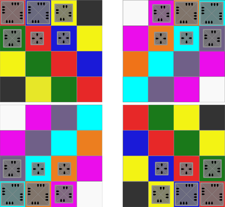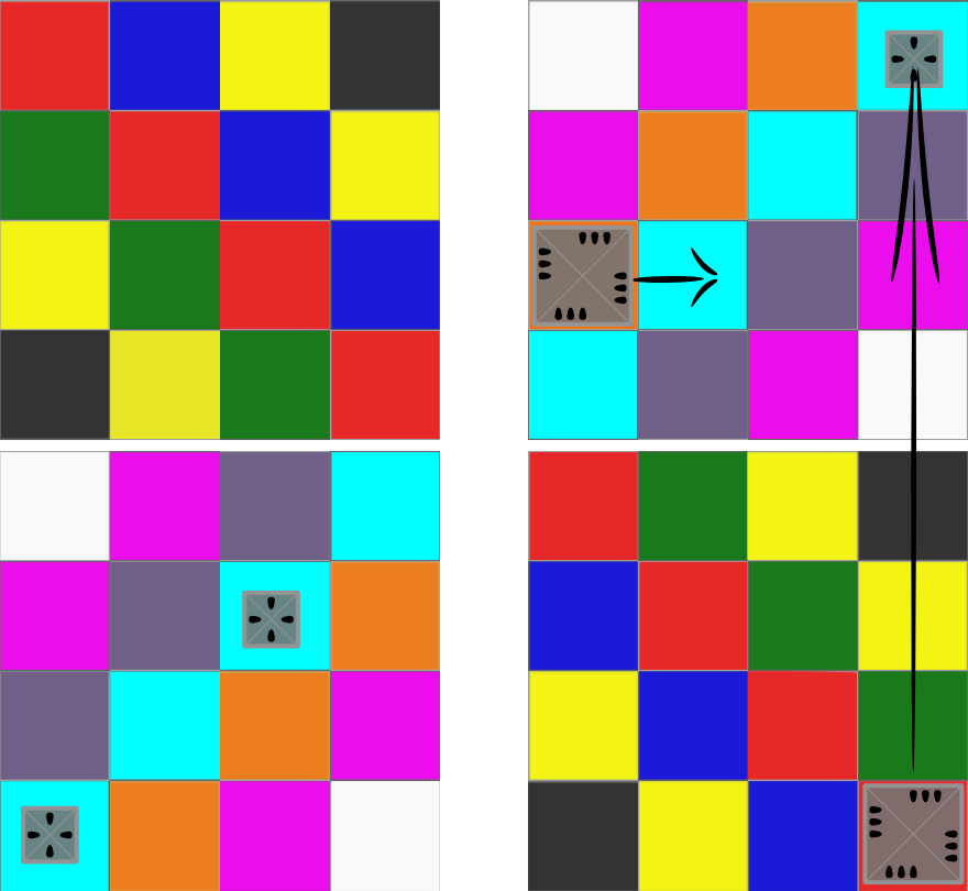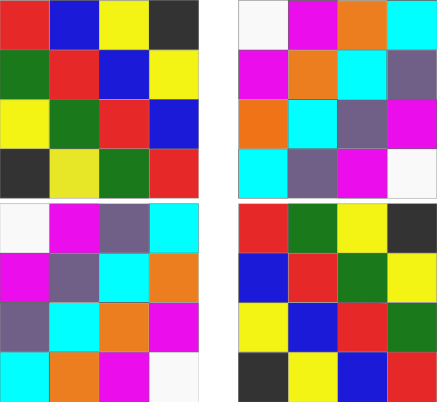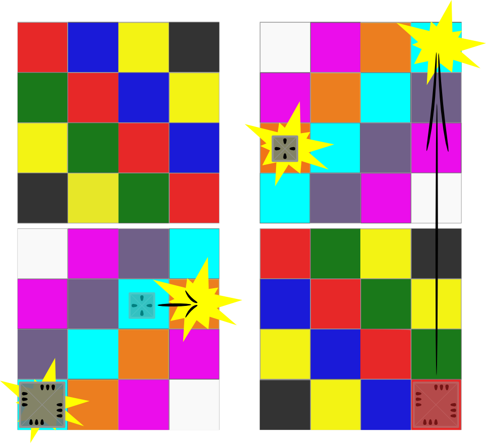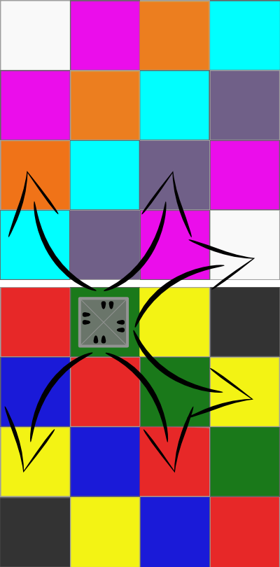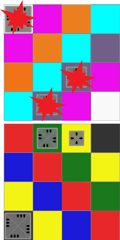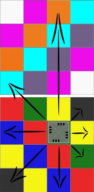 The gameboards, there being two, are transpositions of each other. For any square on one board, when setup as in the diagram above, there is a dual square on the other board on the opposite side. Dual squares are specially colored to more easily identify across the two boards. This coloring is important for devising plans involving teleportation, which is described later.