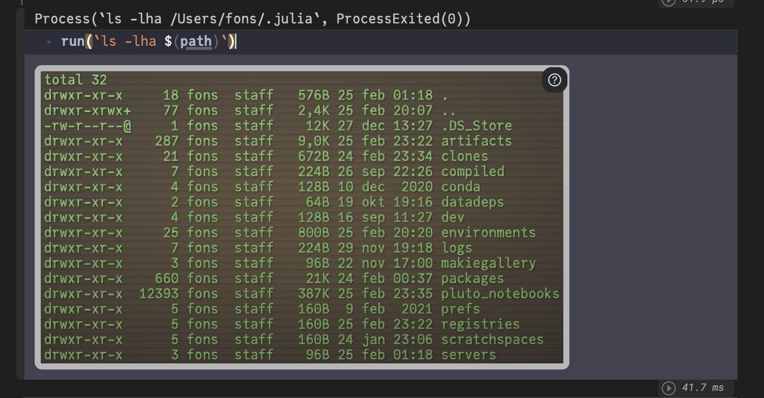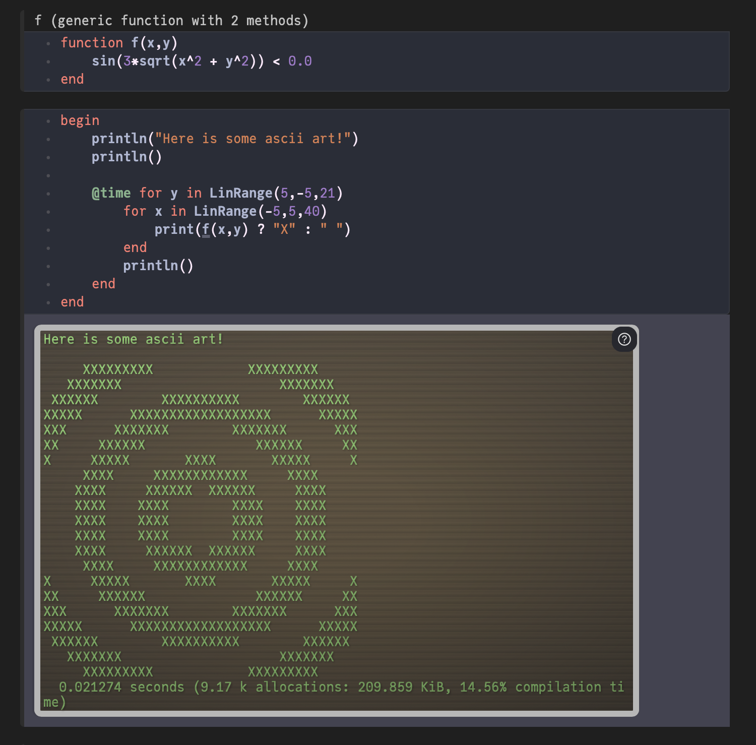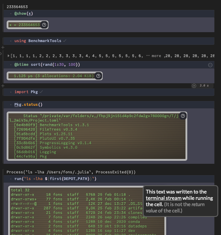 Hi! Small question: Will it be a way to hide stdout/stderr without hiding the returned value? In Jupyter is sometimes annoying (and slow) to run processes that fill stdout with a massive amount of text; would that be also a problem with Pluto in the future? Cheers, |