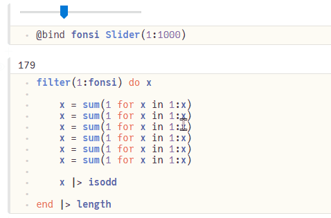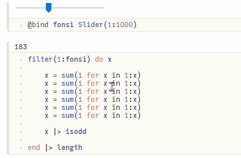 4But still, after this change, even if you include compilation time, things get much faster because you've changed a non-const global into a function argument. For the old case before this PR, julia had to check every iteration of the loop that So even if you include the compilation time, the new system is still faster than evaling the block old way! 🎉 I guess Pluto could consider to separately report the compilation time as well? Julia 1.6 has started doing that: |