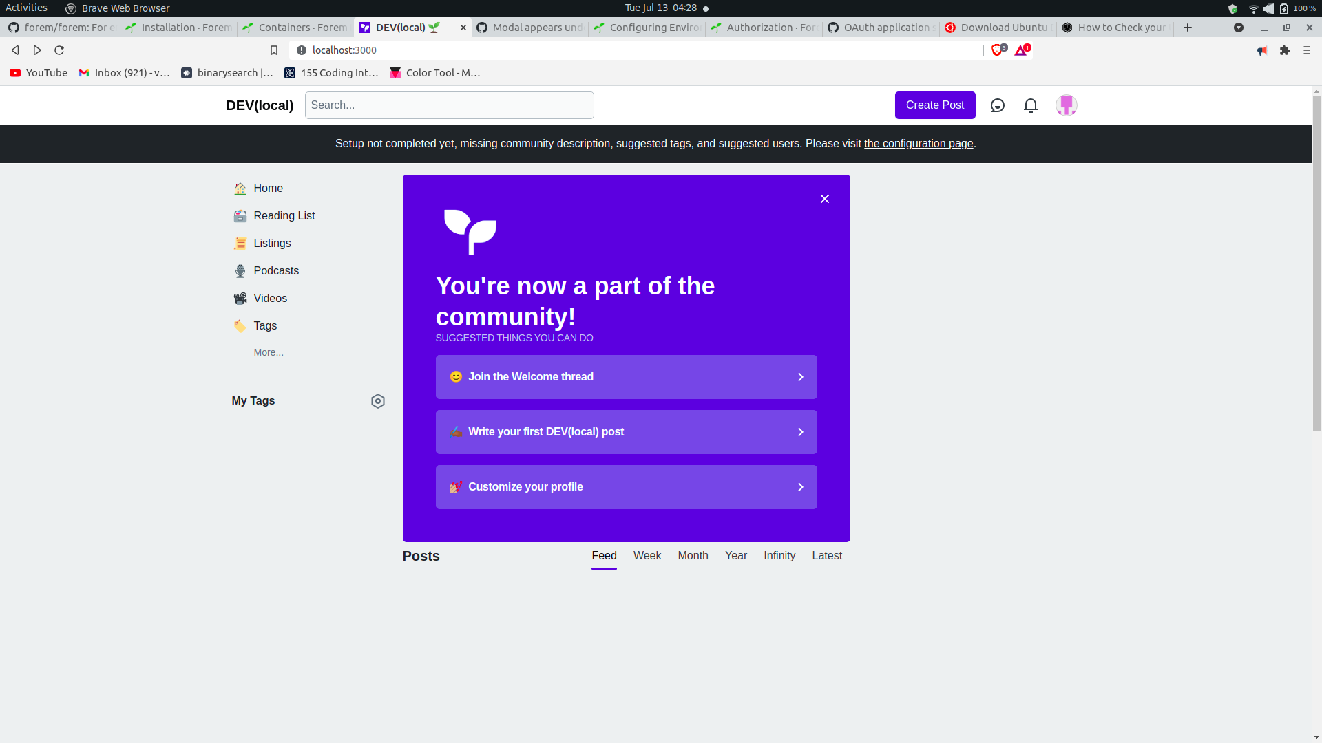 I did that and it's still the same. I added the client id and client key in the .env file as mentioned, re-run the container setup, just in case it was needed, but still not able to login. And yes, the hommepage of local-dev is displaying a message like - Setup not completed yet, missing community description, suggested tags, and suggested users. Please visit the configuration page. On visiting the configuration page, I see something like this What exactly do I need to add in here..? |