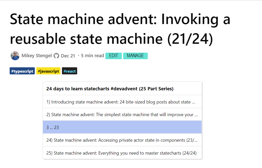 Navigating with the series menu underneath the title. If It's a longer series, the current post might even be hidden as seen in the image below (can't see post 22/23 and have to unfold first)