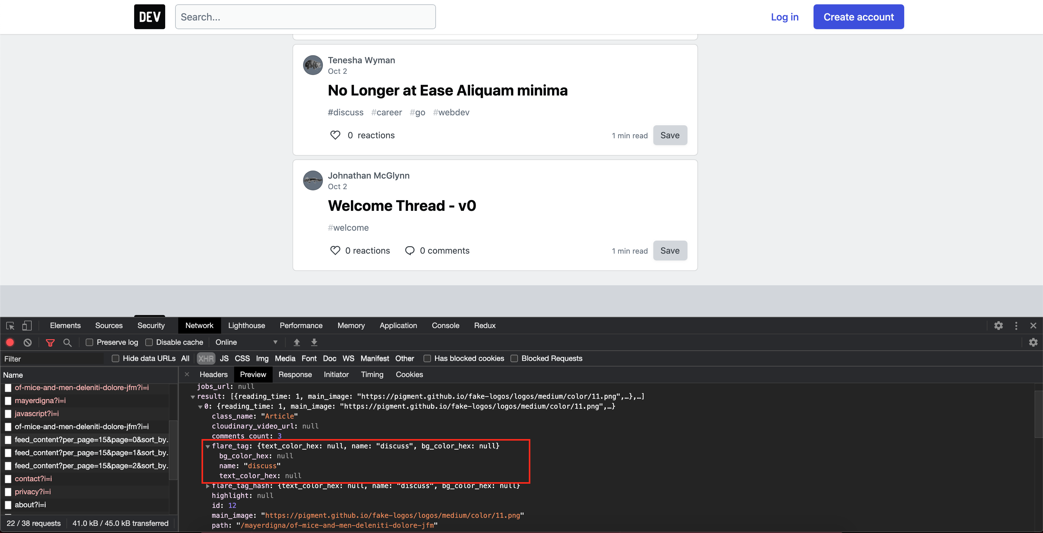 which is passing This comes from https://github.com/forem/forem/blob/master/app/views/articles/_single_story.html.erb I seem to recall that the first page of the feed is rendered one way, subsequent pages are rendered in a different way but I'm not sure how all that works, @joshpuetz or @nickytonline might instantly know what's going on here. There might be a different behavior between the flare tag appearing in the first batch of articles and the following batches |