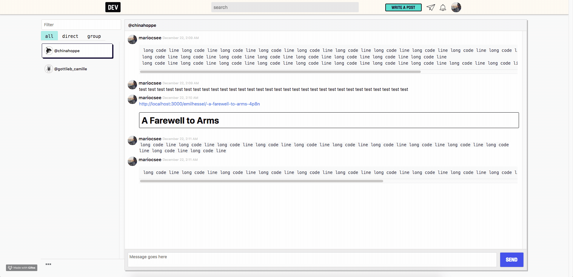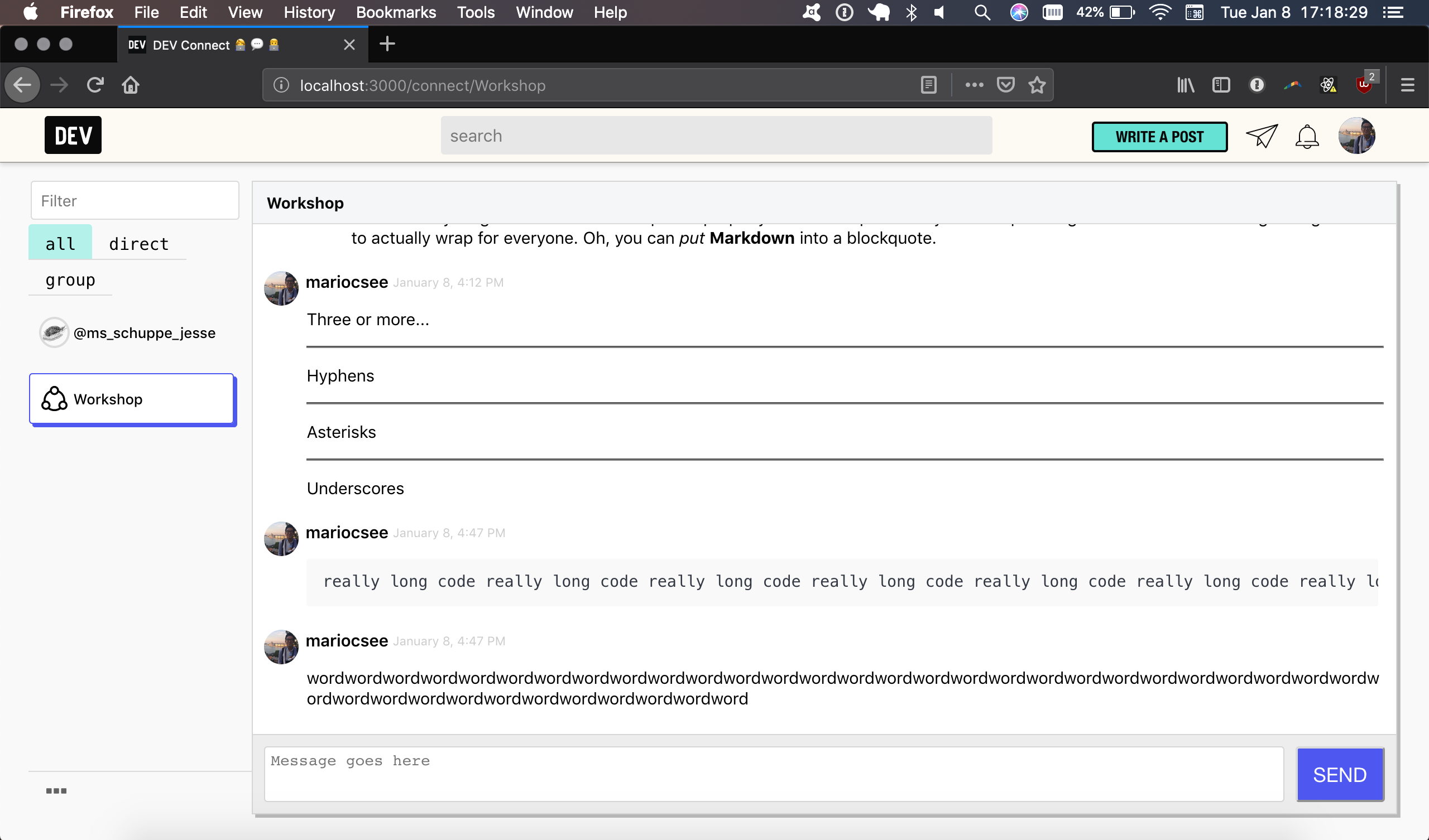 <code>and<pre>took precedence over other HTML elements in Connect. Rather than using the previous approach and forcing breaks in the line, I have addedwidthassertions in CSS to prevent the channel list on the left and the channel content on the right from being squished. The code blocks and messages are capped and adjust to the opening and closing of content on the right.One notable change I have made is that in mobile, is that when right content is opened, rather than pushing all others to the left, I decided to overlay it on top of the chat preventing a horizontal scroll from appearing on mobile pages.