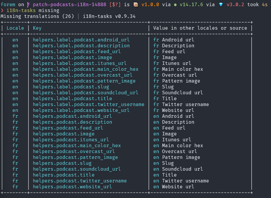 Extracts strings for i18n from app/views/podcasts and related. Attached fr locales for testing purposes. Existing translations up to #15002 reflected (hopefully).