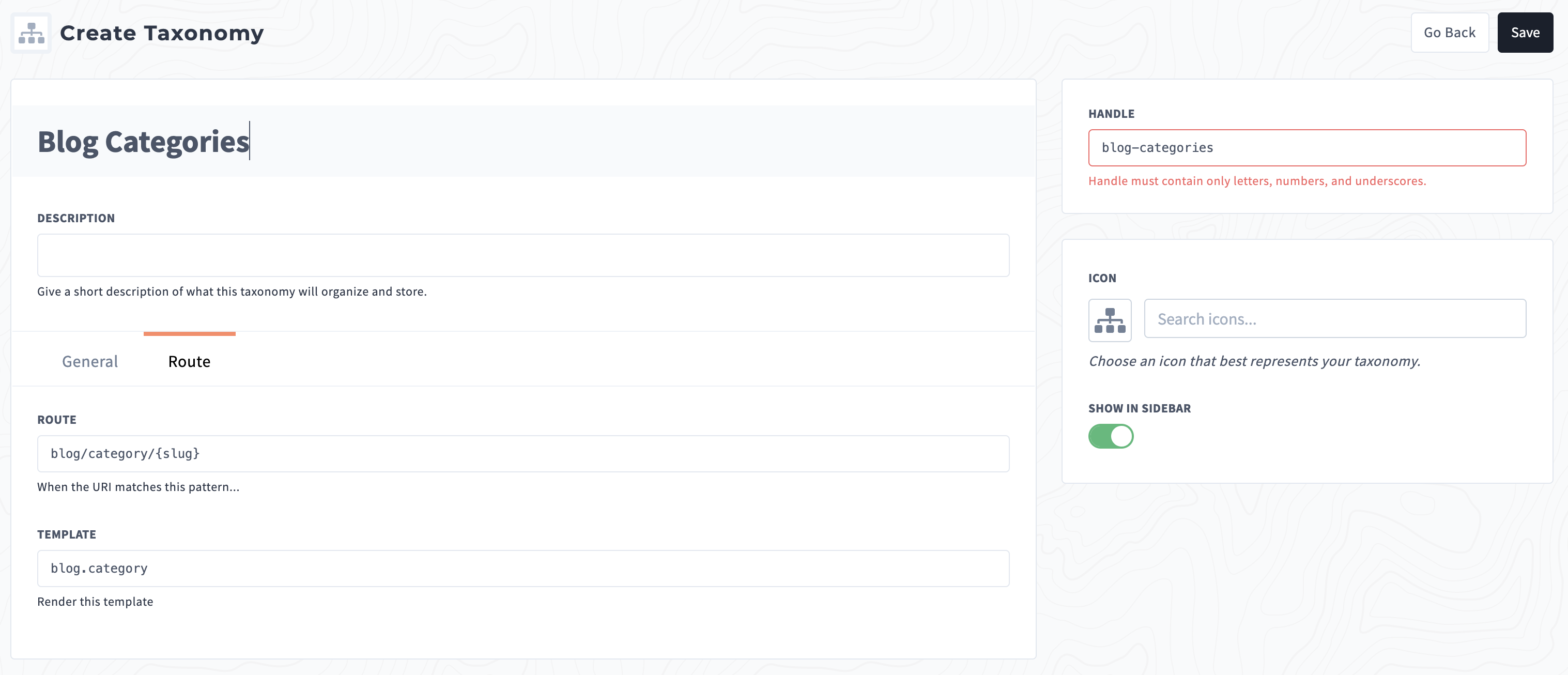 When creating a new taxonomy, the name is used to auto generate the handle. However, the name in the handle input is auto-formatted like a slug with dashes (-) instead of underscores (_). This will cause a validation error when you attempt to save the taxonomy, forcing you to manually format the handle to replace dashes with underscores.