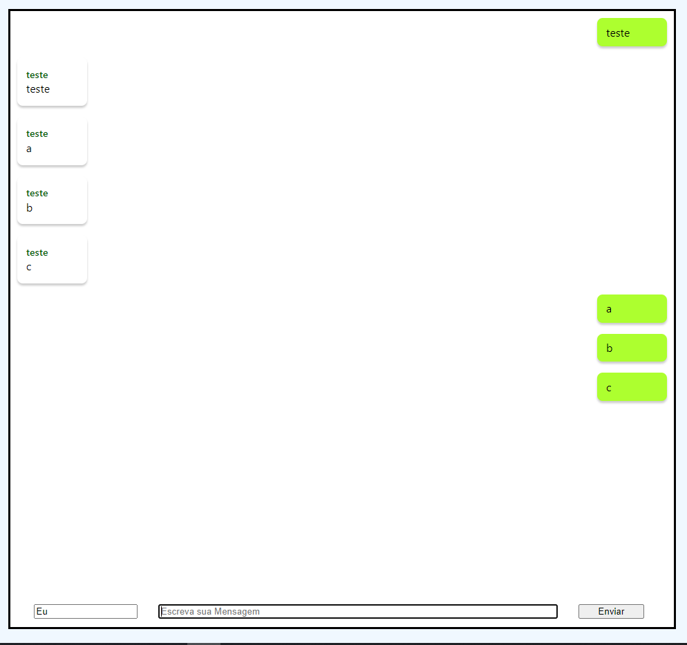 Observações: O desafio de apagar a mensagem com dois cliques não foi feito e o scroll não está focando na mensagem mais recente, ambos por falta de tempo.