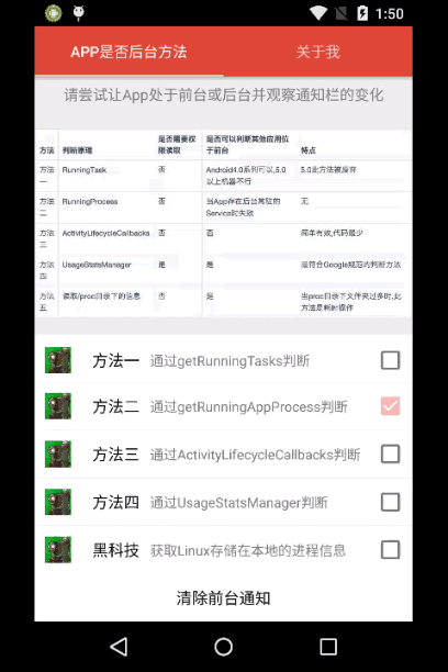 最后一种方法堪称Android黑科技(非原创),既可以突破Android5.0以上的权限封锁,获取任意前台App的包名,又不需要权限,此方法并非我原创,原作者是国外的大神,GitHub项目在这里,也一并加入到工程中,供大家做全面的参考选择