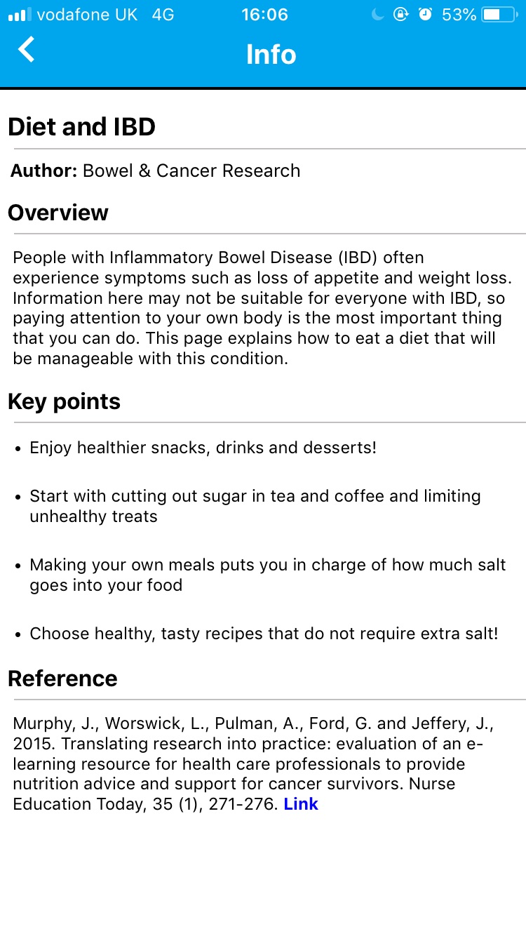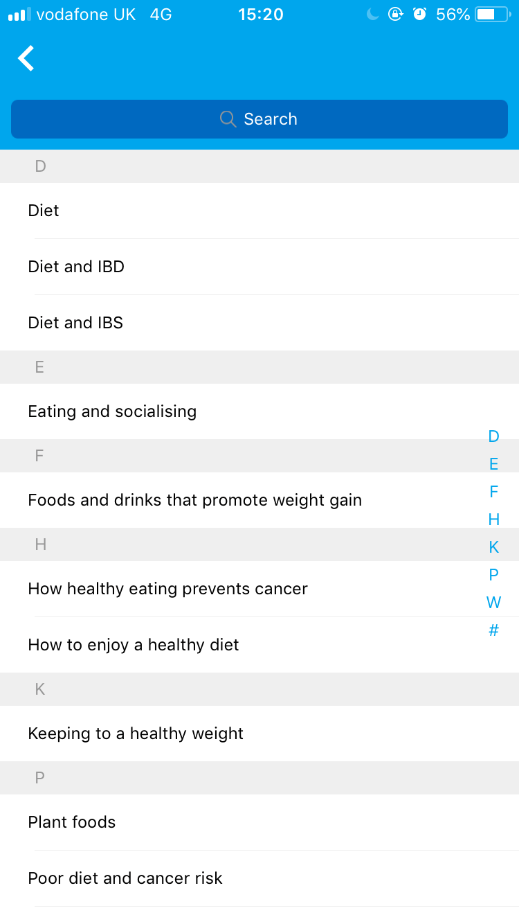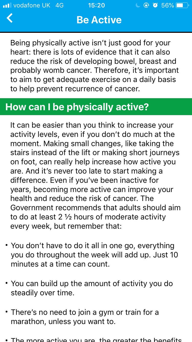 The app also offers a section for health care professionals involved in caring for people living beyond cancer. This acts a resource for professional guidance and information around the various types of cancer.