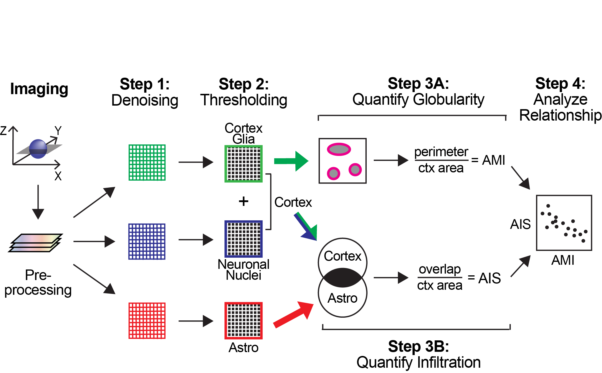 Step 3B: Combine cortex glia and neuronal nuclei channels to define the cortex area (ctx). Calcuate overlap between the cortex and astrocyte (astro) channels. Normalize to total cortex area to produce an automated infiltration score (AIS).